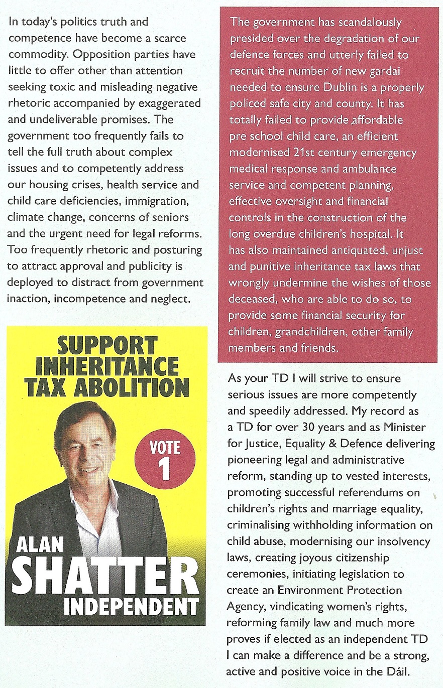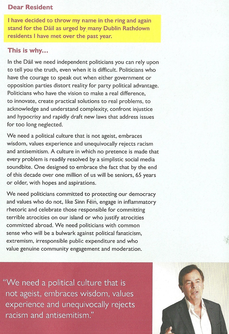 A Leaflet from Alan Shatter who is running as an Independent in Dublin Rathdown in the 2024 General Election