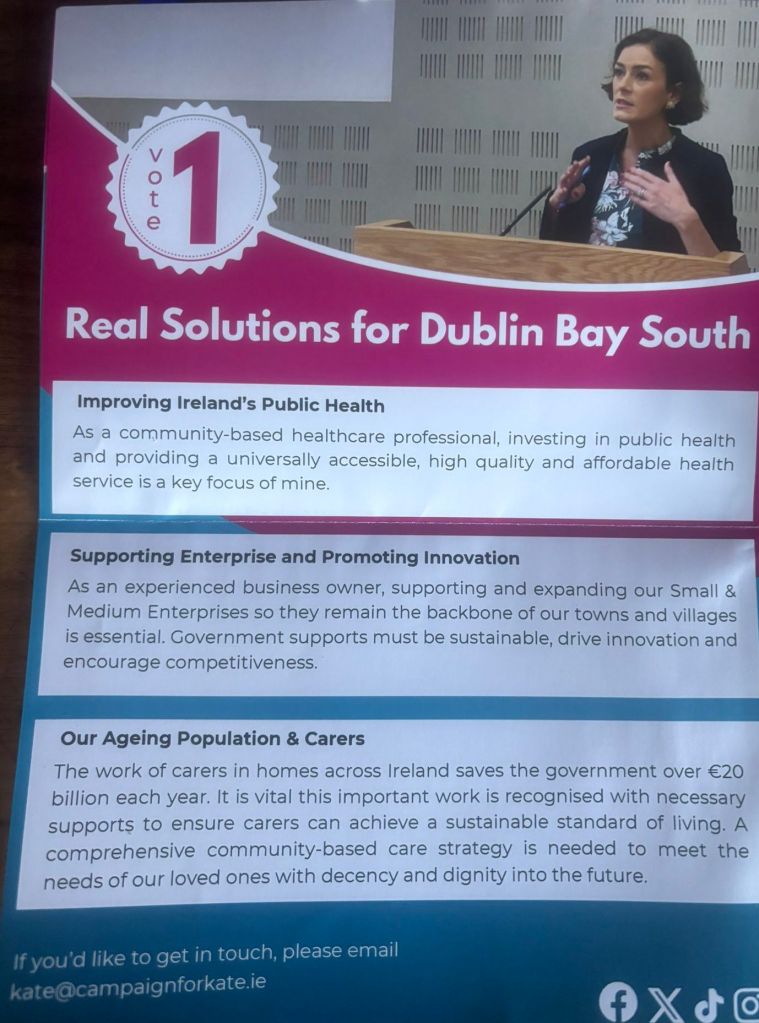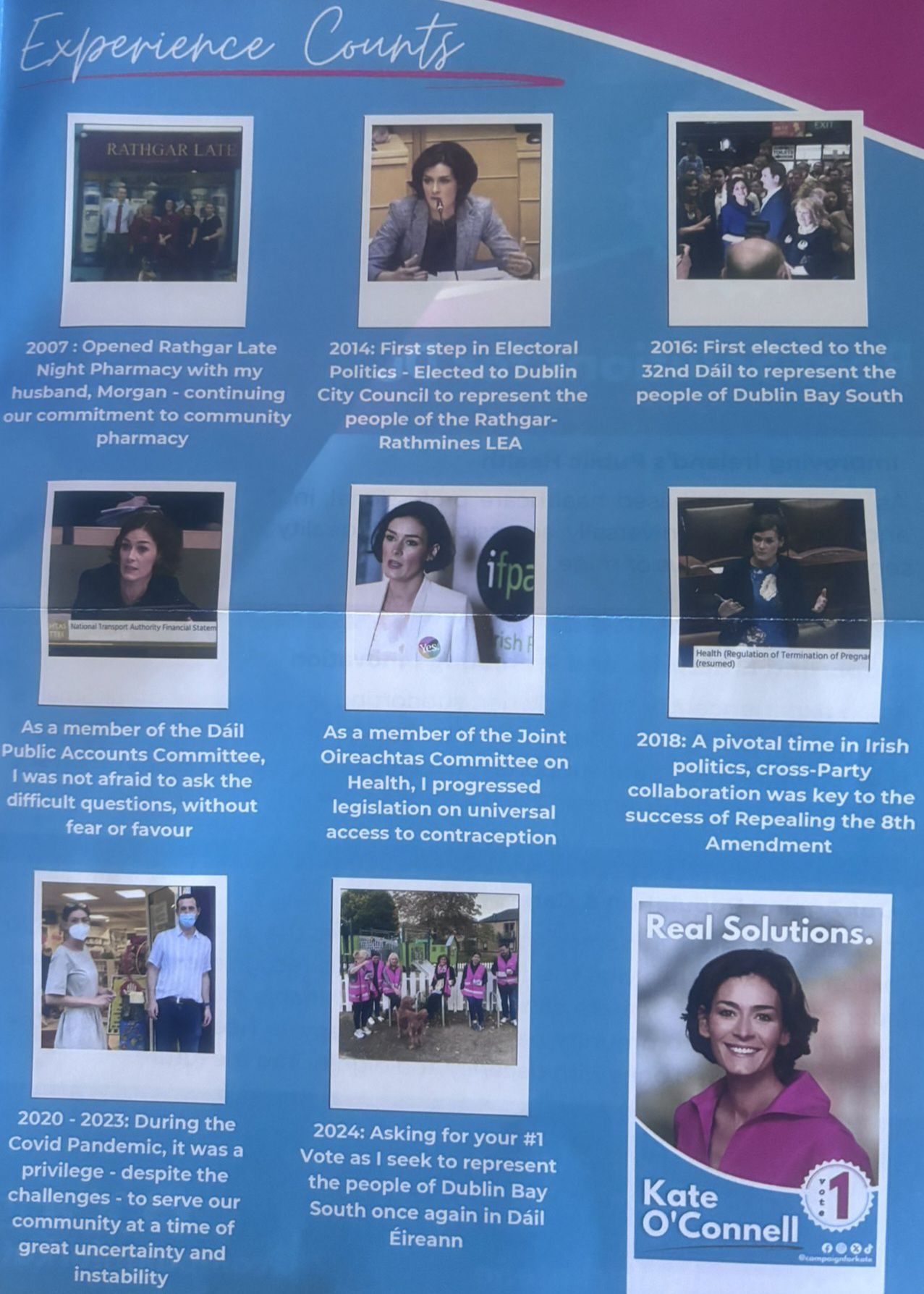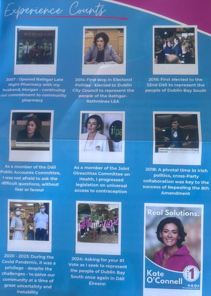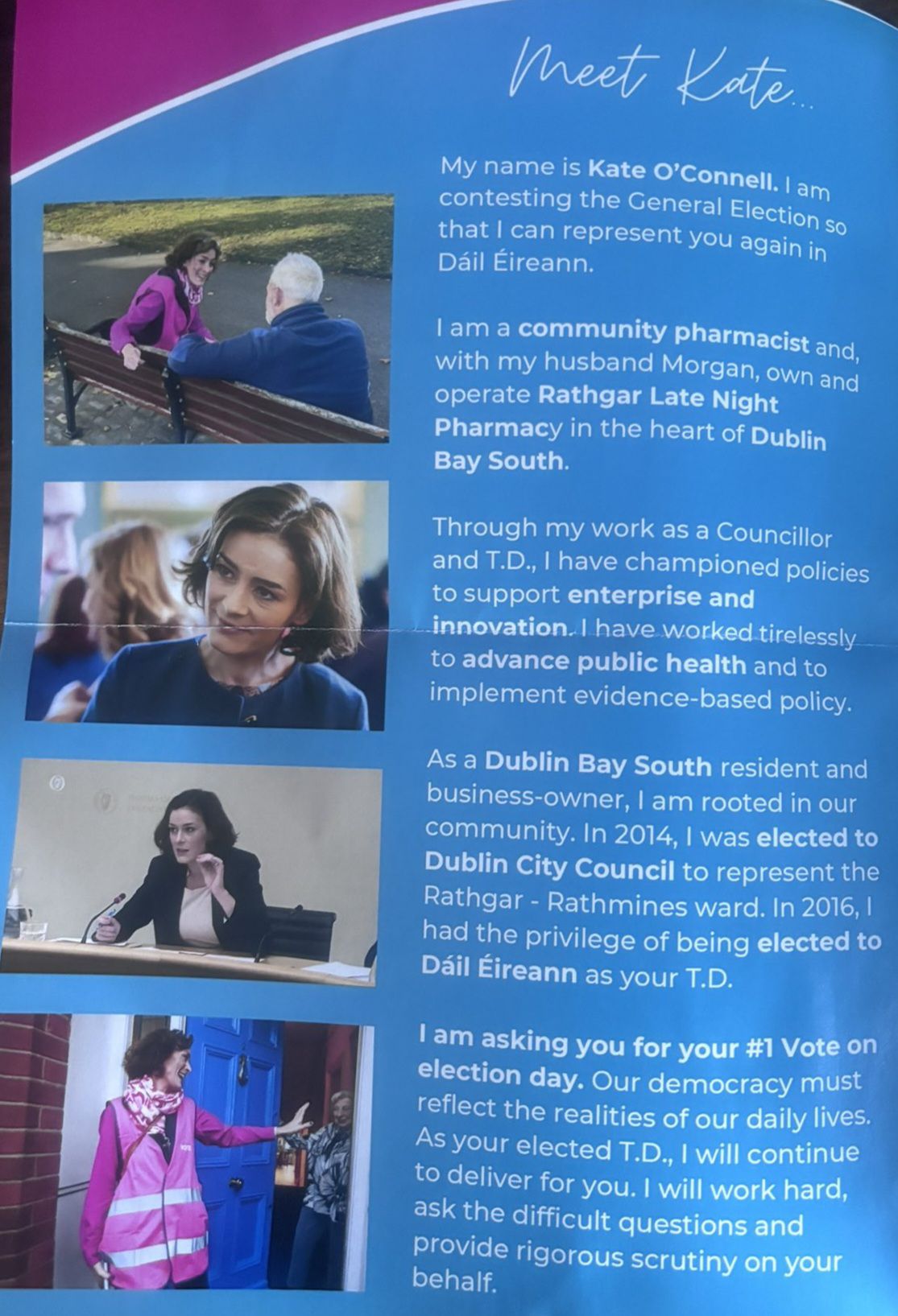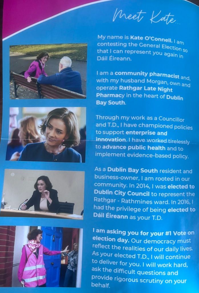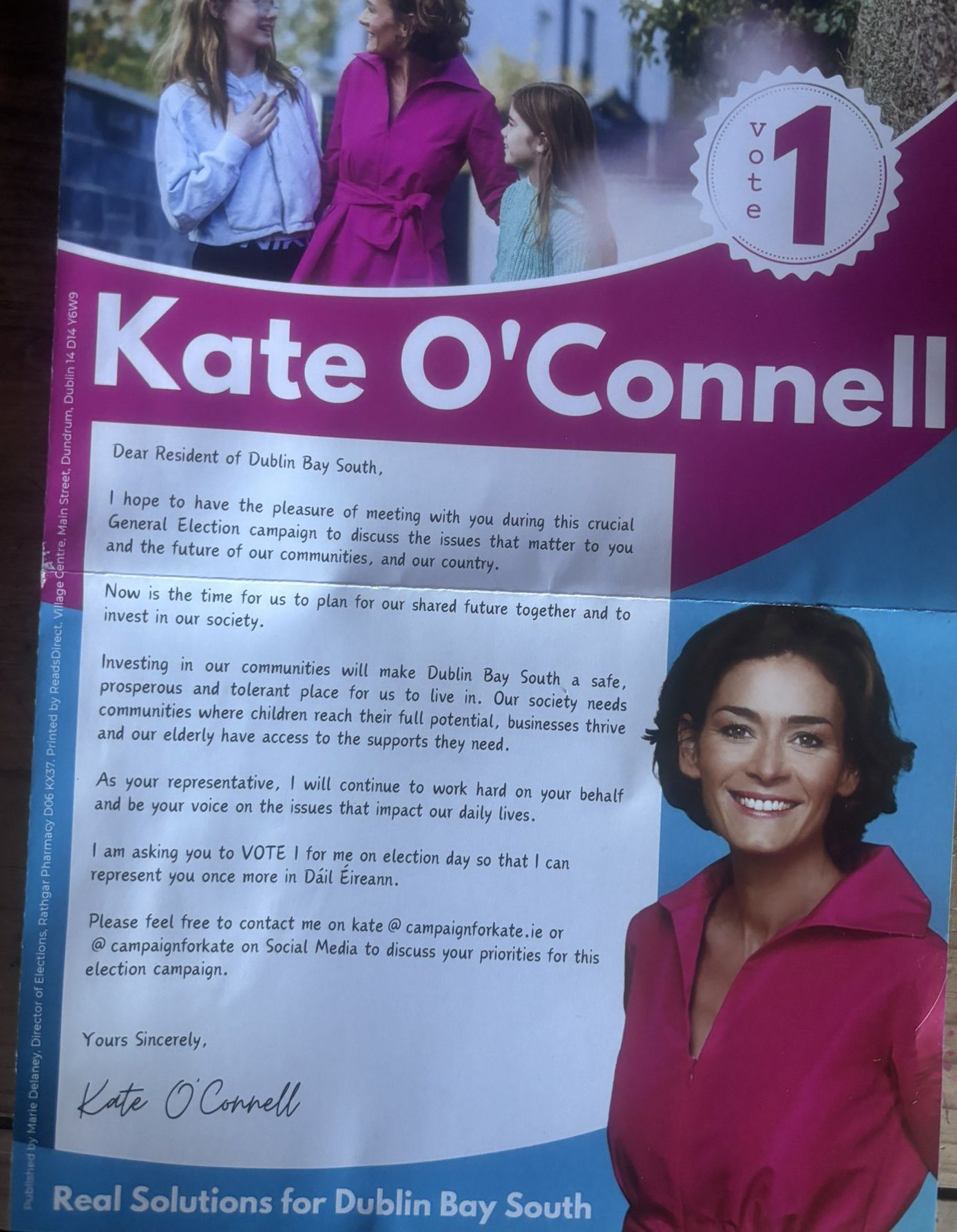 A leaflet from Kate O’Connell who is running as an Independent in Dublin Bay South in the 2024 General Election