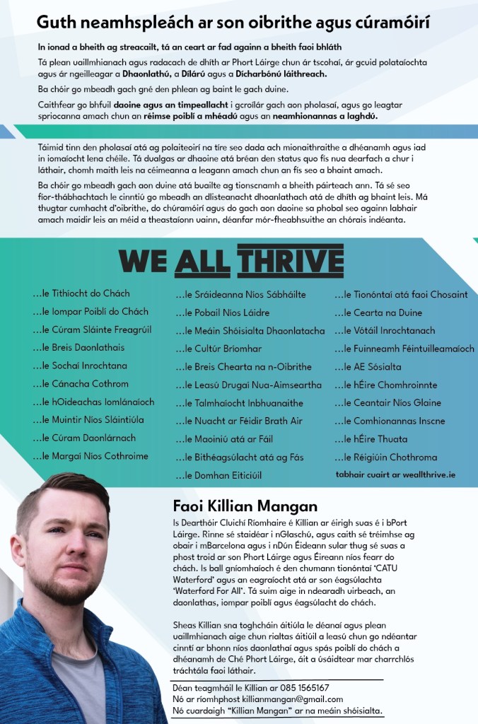 A Leaflet, as Bearla agus as Gaelige from Killian Mangan who is running as an Independent in Waterford in the 2024 General Election