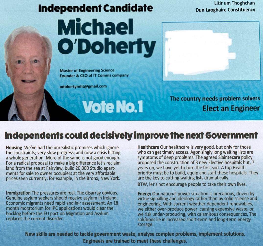 “Elect an Engineer” – Leaflet from Michael O’Doherty – Independent – Dún Laoghaire – 2024 General Election » MichaelODohertyGE24a