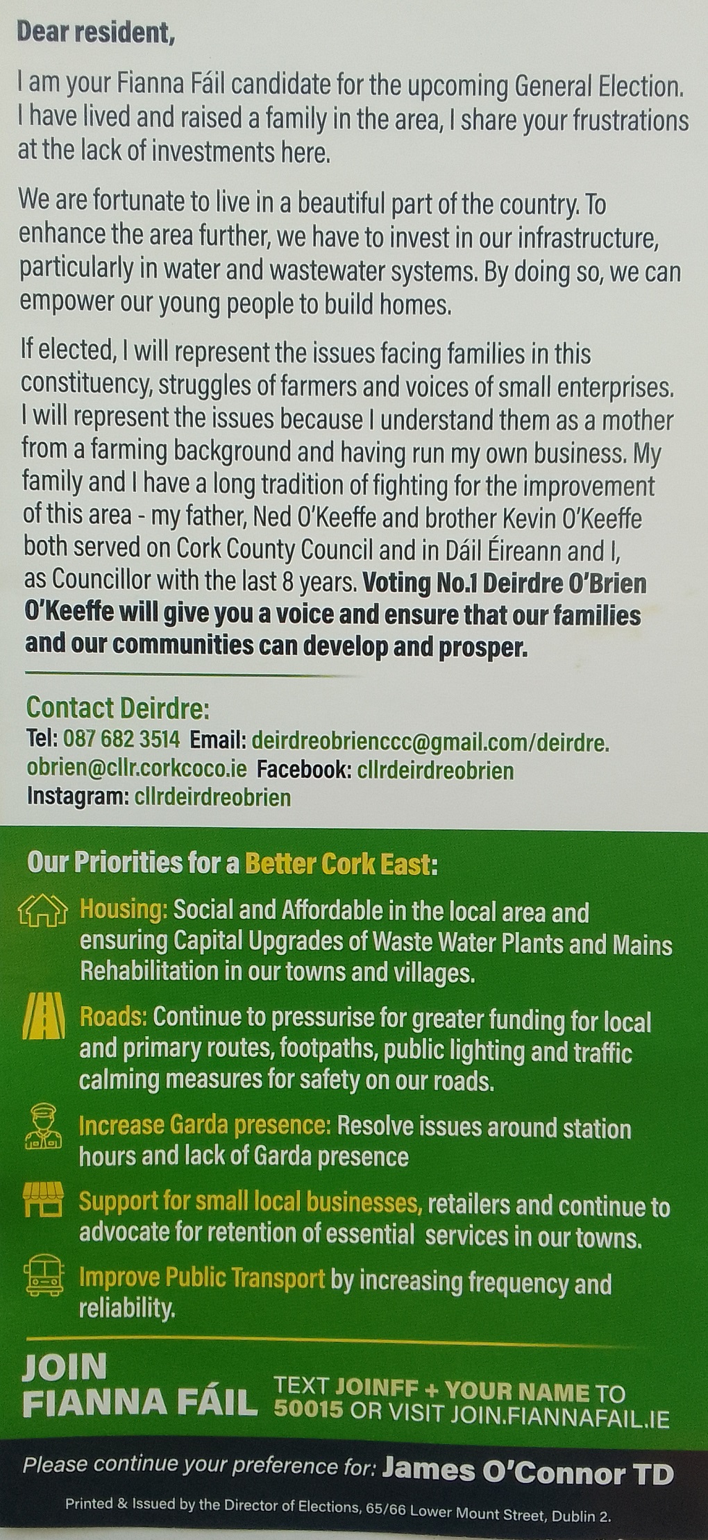 A Leaflet from Deirdre O’Brien O’Keefe who is running for Fianna Fáil in Cork East in the 2024 General Election