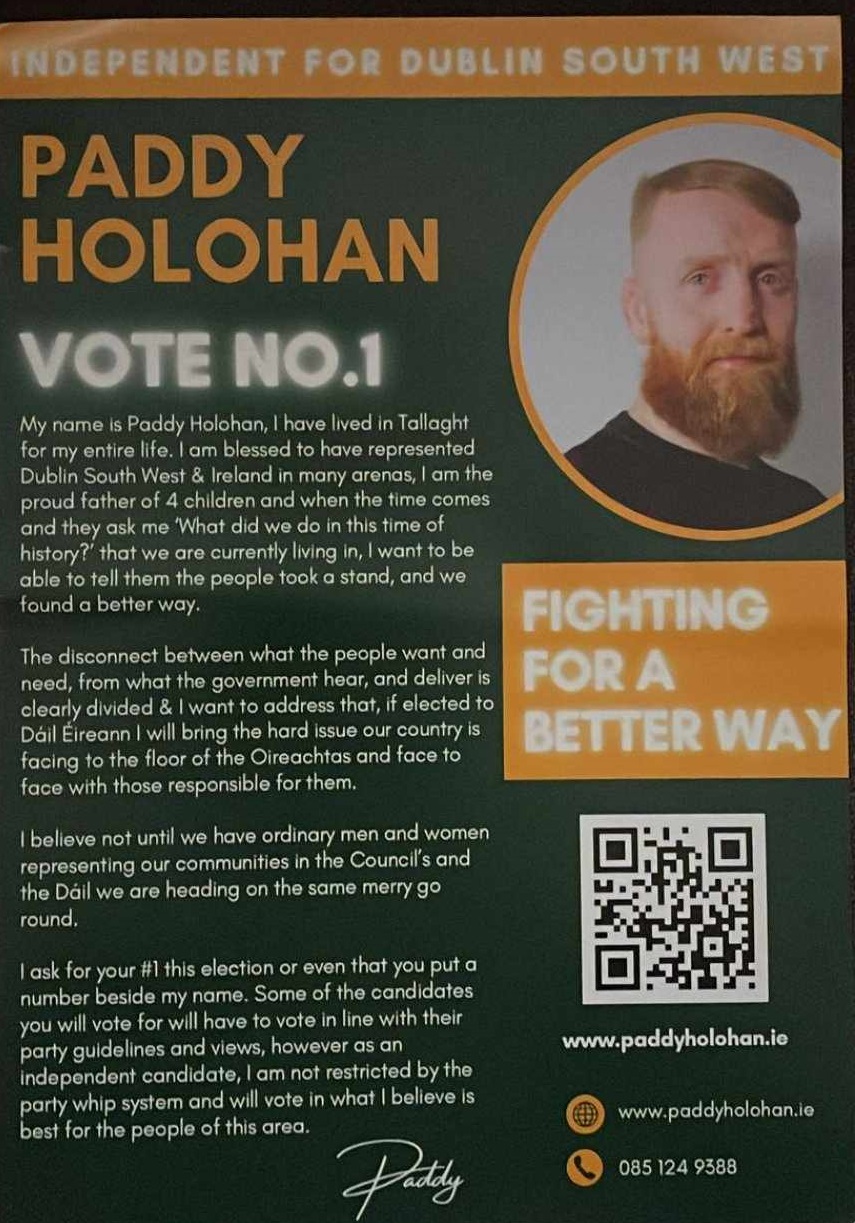 Leaflet from Paddy Holohan – Independent – Dublin South West – 2024 General Election » PaddyHolohanGE24a