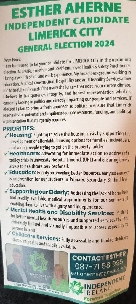 A Leaflet from Esther Aherne who is running for Independent Ireland in Limerick City in the 2024 General Election