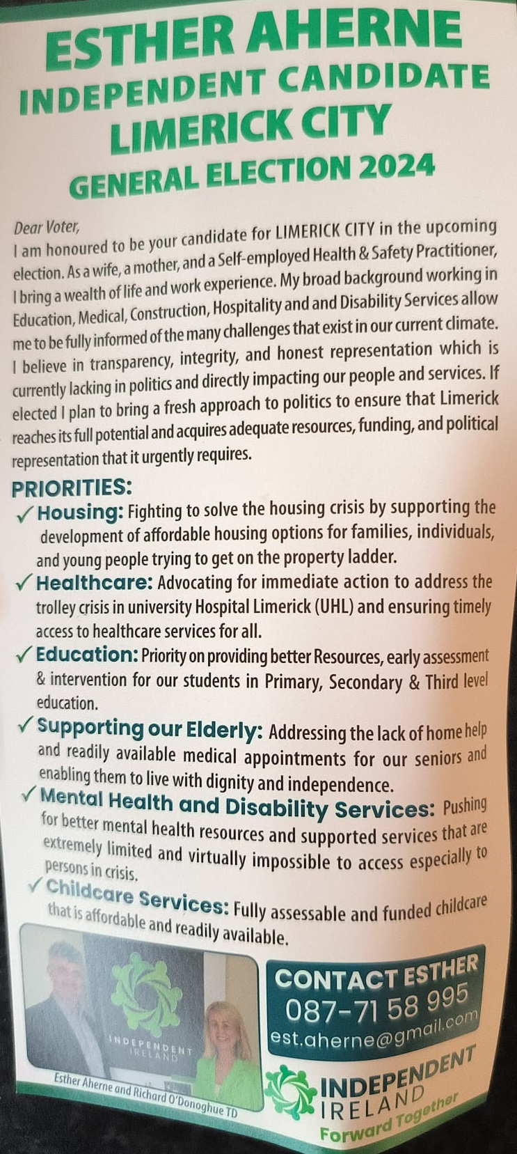 Leaflet from Esther Aherne – Independent Ireland – Limerick City – 2024 General Election » EstherAherneGE24b