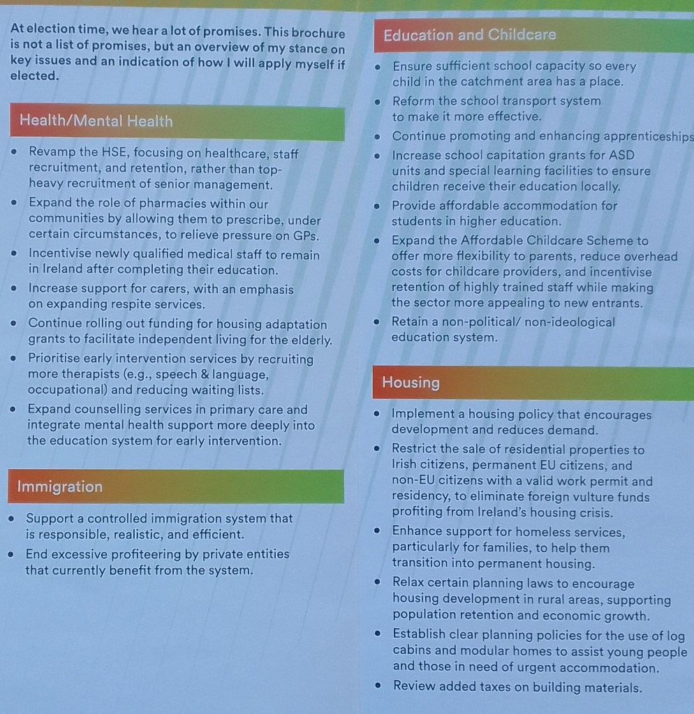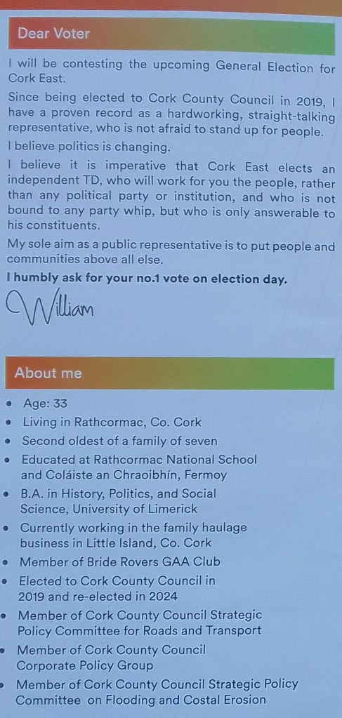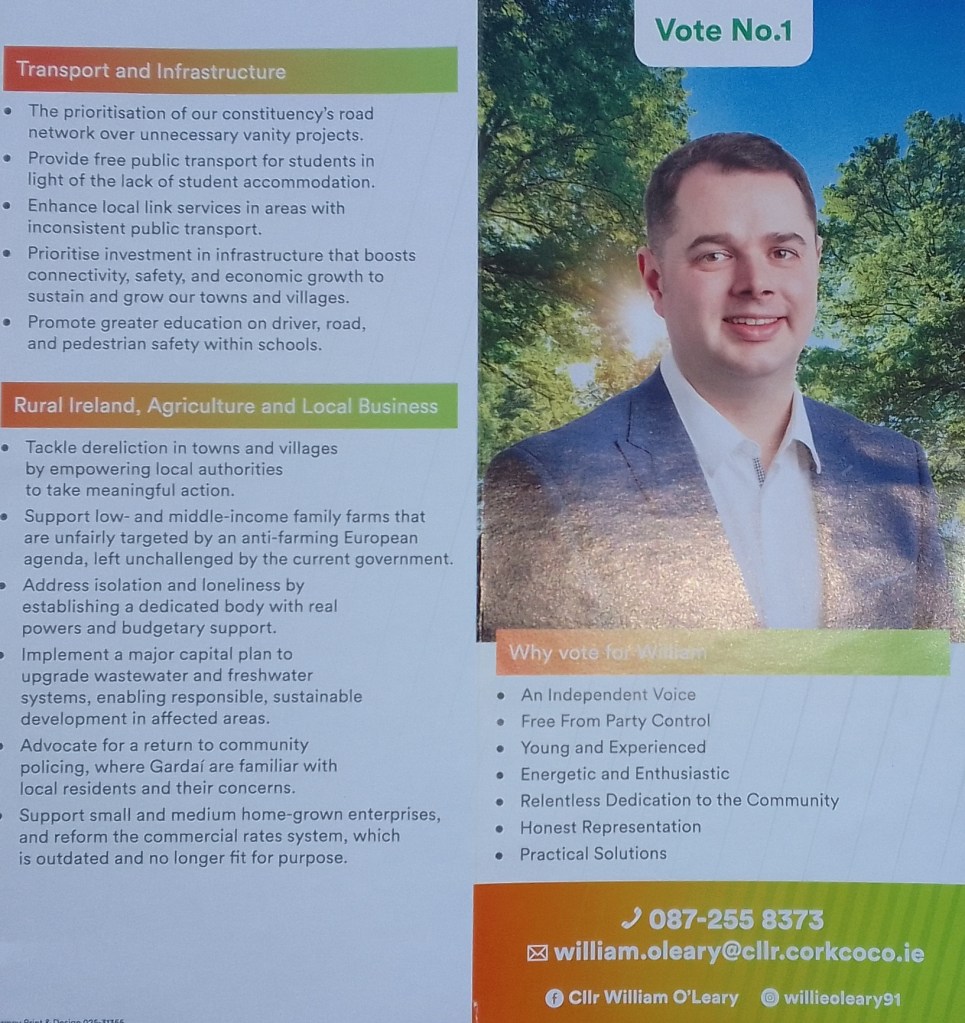 A leaflet from William O’Leary running as an Independent in Cork East in the 2024 General Election