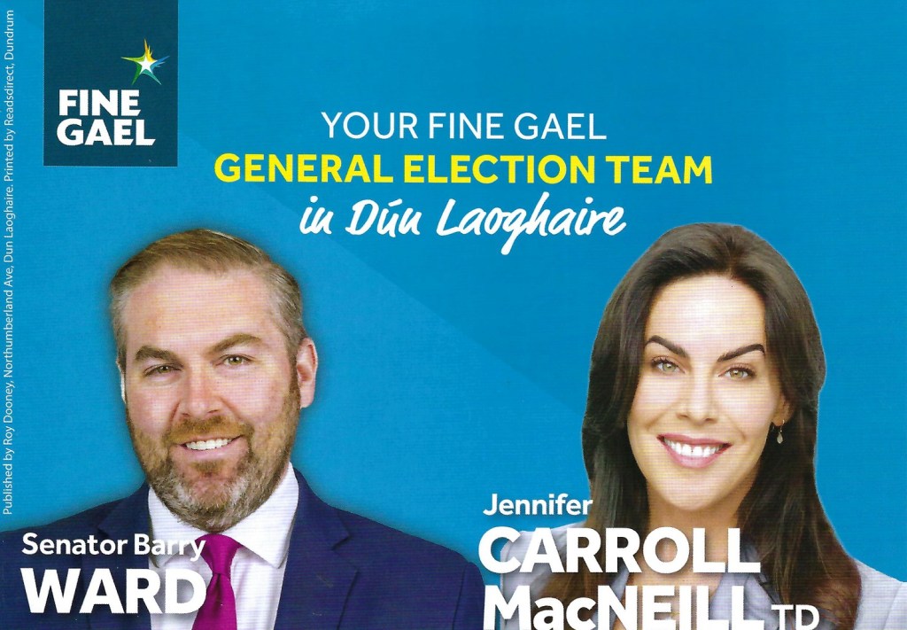 A Vote Management Leaflet form Fine Gael in Dún Laoghaire asking voters in a certain area to vote Barry Ward number one and Jennifer Carroll MacNeill number 2. From the 2024 General Election Campaign