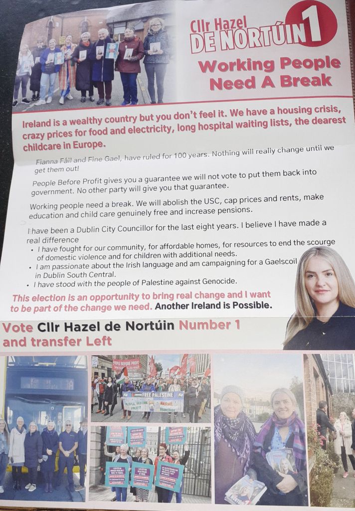 A Leaflet with an endorsement from Bríd Smith for Hazel De Nortúin who is running for People Before Profit in Dublin South Central in the 2024 General Election