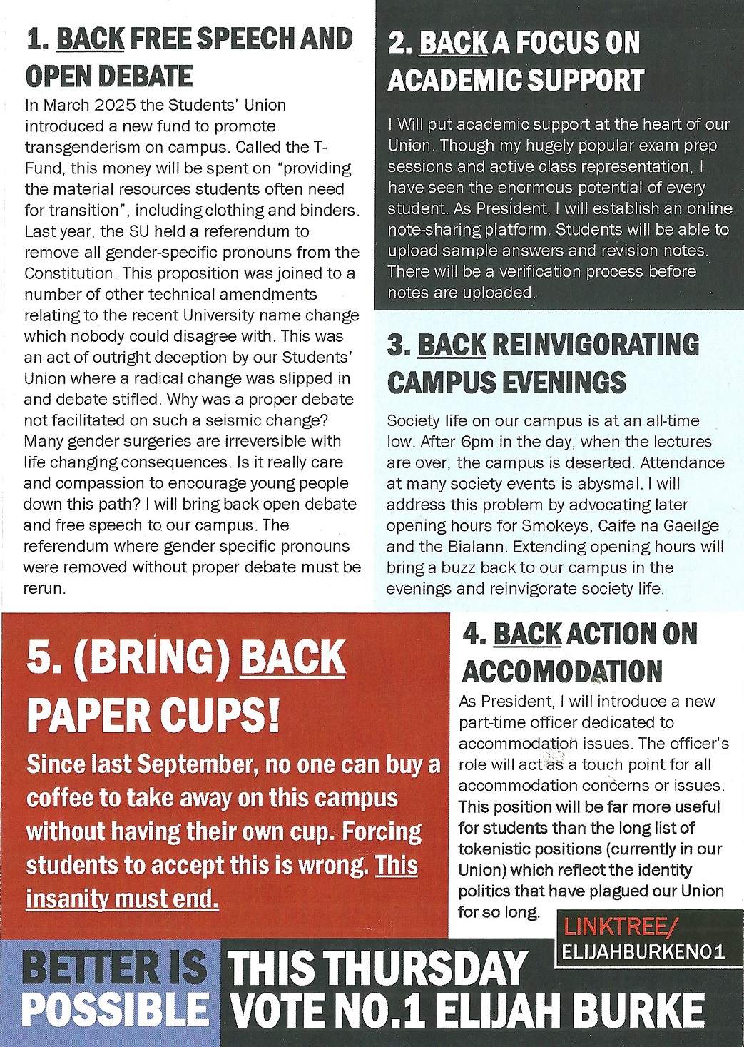 A leaflet from Elijah Burke who ran in the 2025 University of Galway Student Union Presidential Election. He polled around 13% of the vote and missed out. Many thanks to the sender
