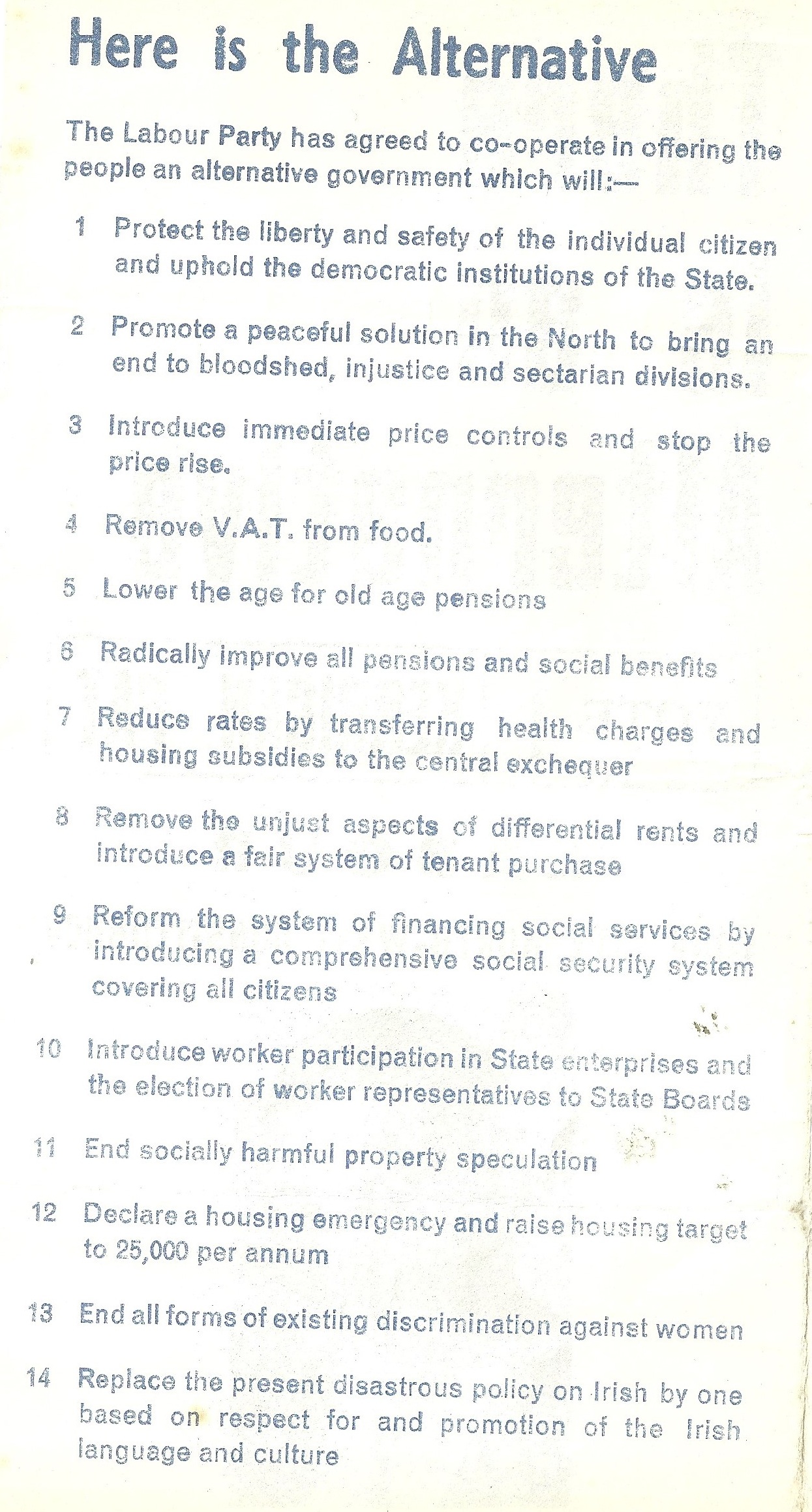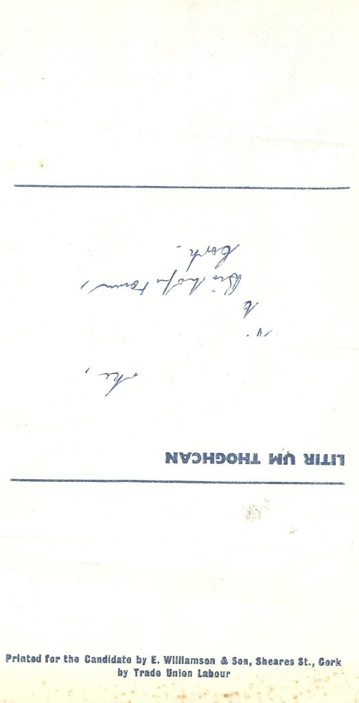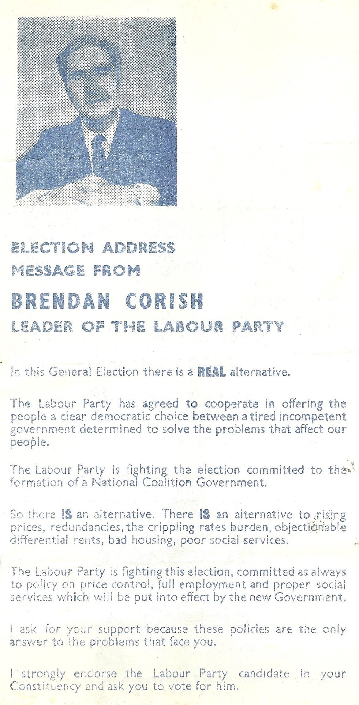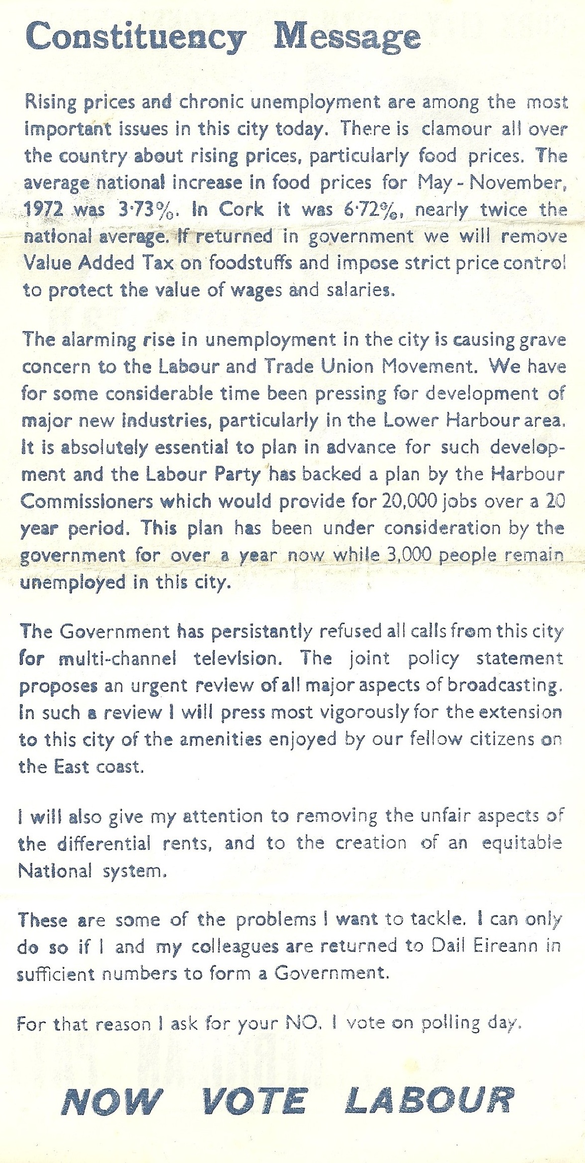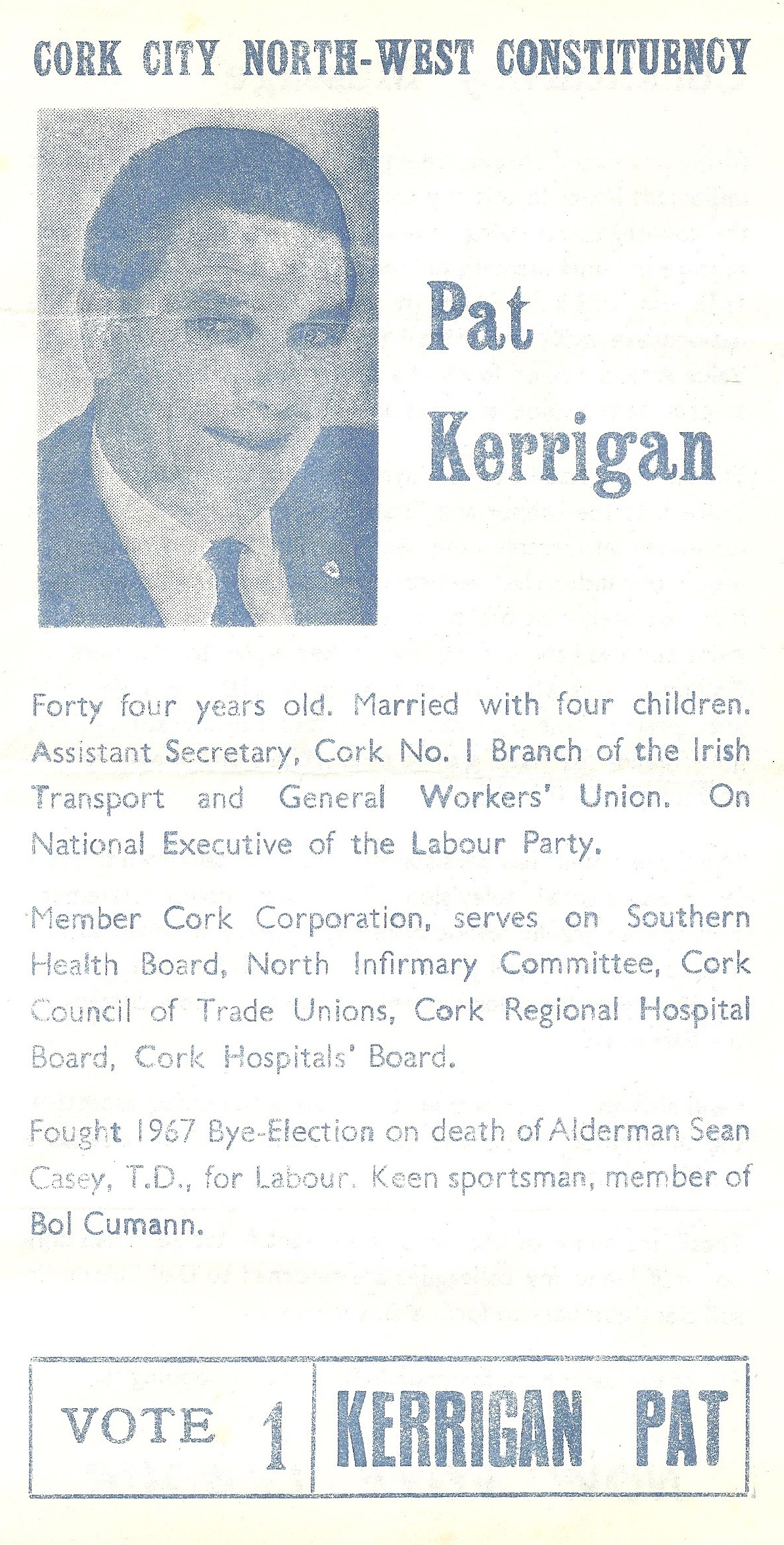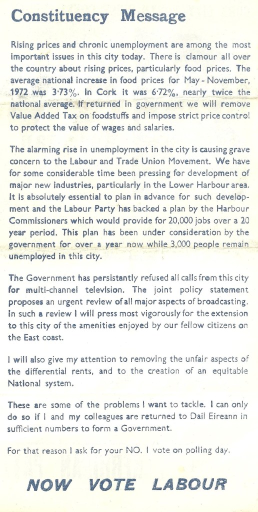 A leaflet from Patrick Kerrigan who was running for Labour in Cork City North West in the 1973 General Election. He polled 2,425 votes and missed out on a seat. He was subsequently appointed to The Seanad and was elected to the Dáil in 1977. Many thanks to the sender