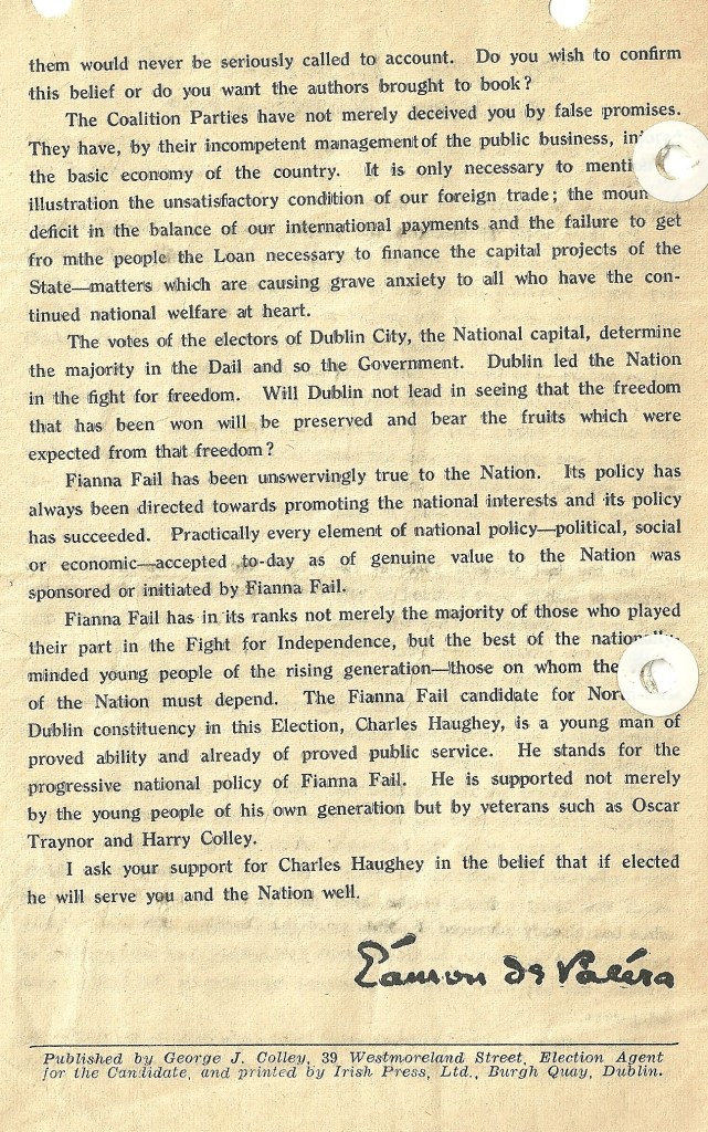 From the 1956 Dublin North East By-Election (caused by the death of Alfie Byrne) a leaflet from Charles Haughey running for Fianna Fáil. He polled 13,950 votes losing out to Alfie Byrnes son Patrick ,who polled 18129 votes.
