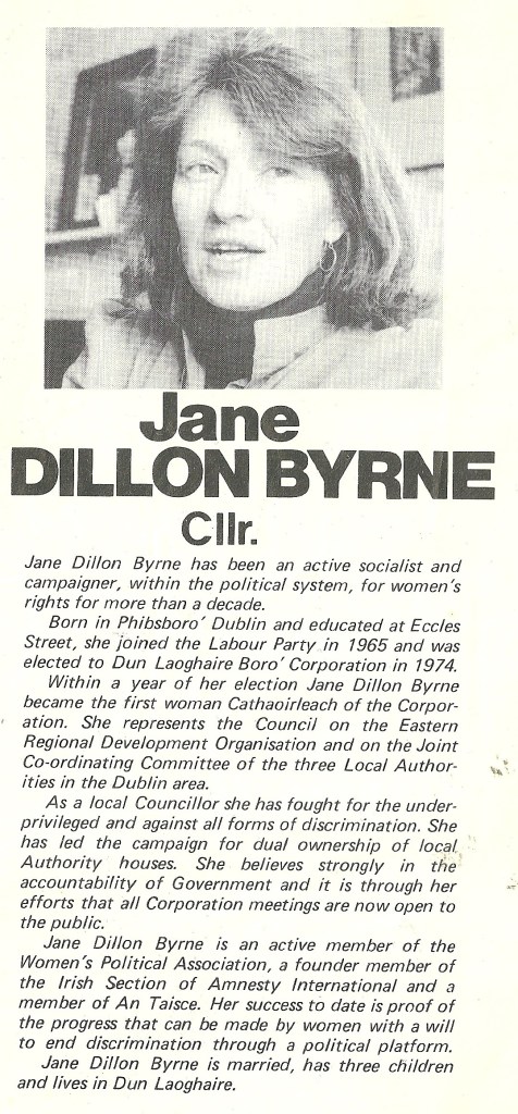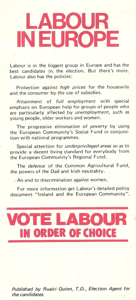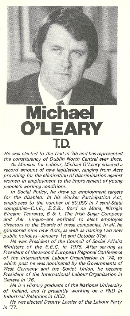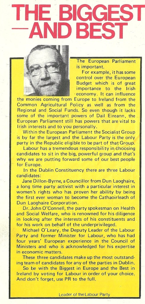 From the 1979 European Elections a leaflet for John O’Connell, Michael O’Leary and Jane Dillon-Byrne who were running for Labour in Dublin. O’Connell and O’Leary were elected. Both later left the Party with O’Leary , despite having been party leader joining Fine Gael and O’Connell becoming an Independent before joining Fianna Fáil.