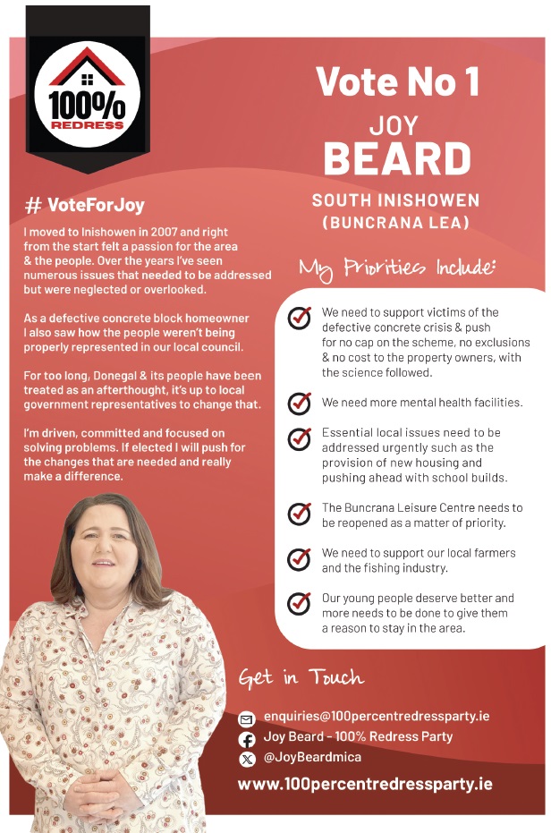 A leaflet from Joy Beard who is running for the 100% Redress Party in Buncrana in the 2024 Local Elections