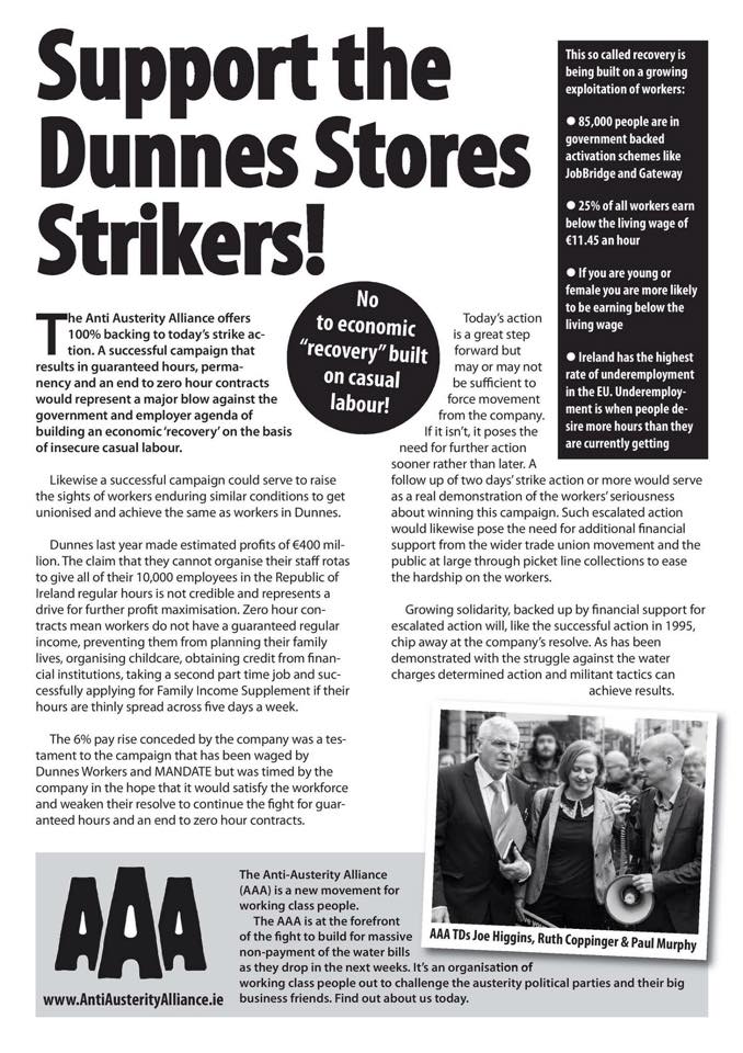“Support the Dunnes Stores Strikers!” leaflet from the Anti Austerity Alliance July 2, 2015