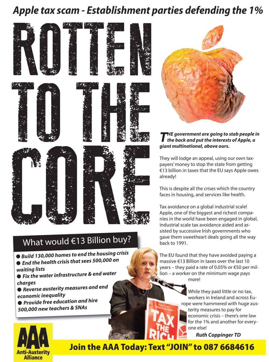 “Apple tax scam -Establishment parties defending the 1%…. Rotten to the Core” leaflet from the Anti Austerity Alliance.