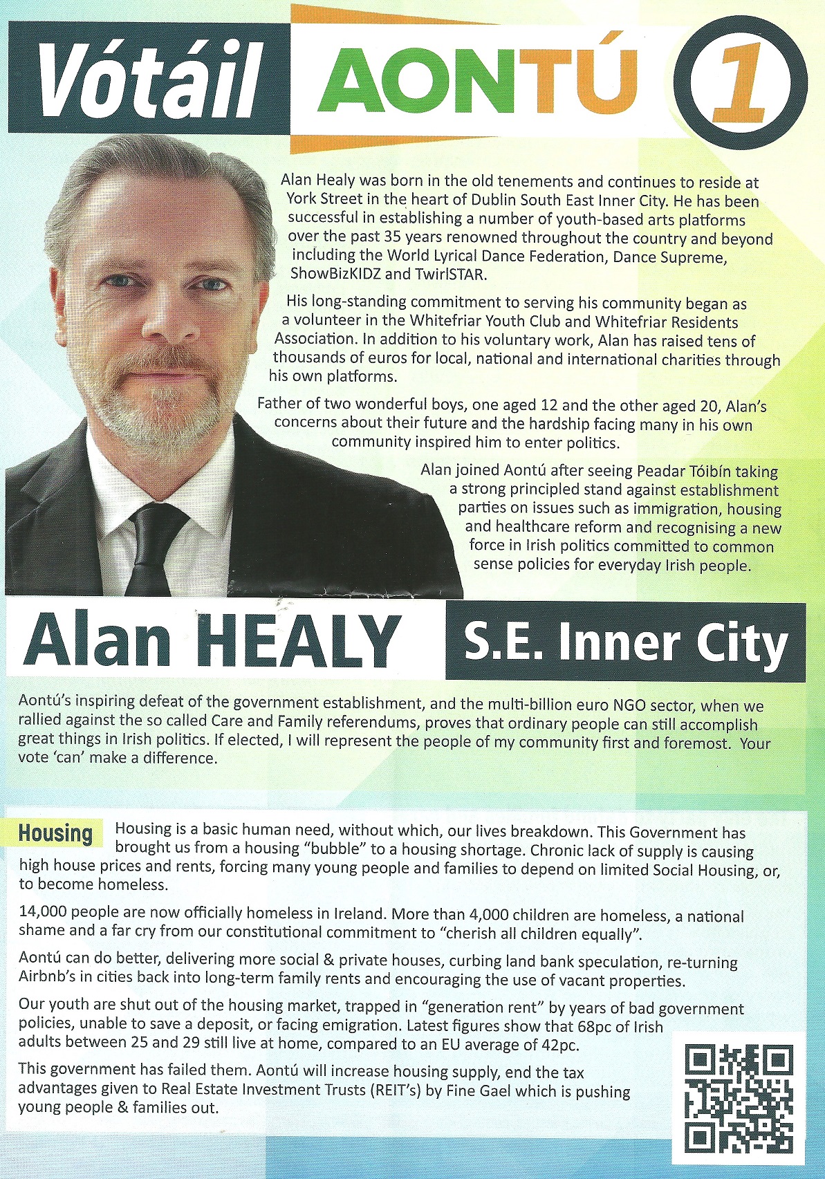 A leaflet from Alan Healy who is running for Aontú in Dublin’s South East Inner City in the 2024 Local Elections