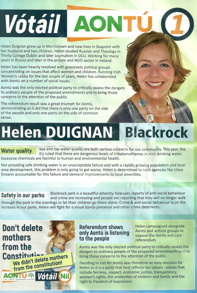 A leaflet from Helen Duignan who is running for Aontú in Blackrock in the 2024 Local Elections