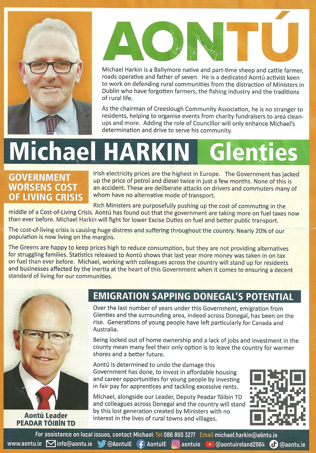 A leaflet from Michael Harkin who is running for Aontú in Glenties in the 2024 Local Elections.