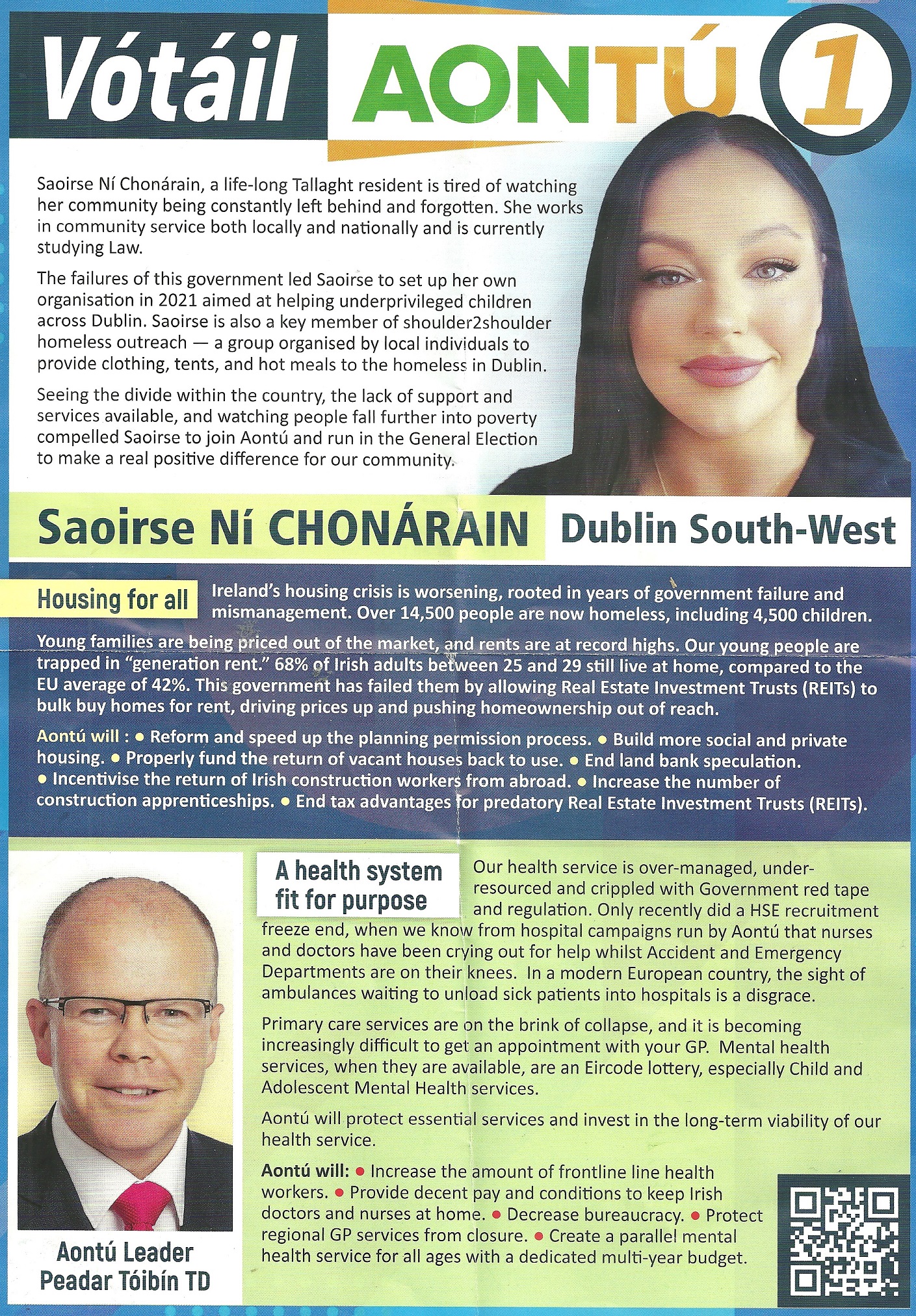 A Leaflet from Saoirse Ní Chonárain who is running for Aontú in Dublin South West in the 2024 General Election.