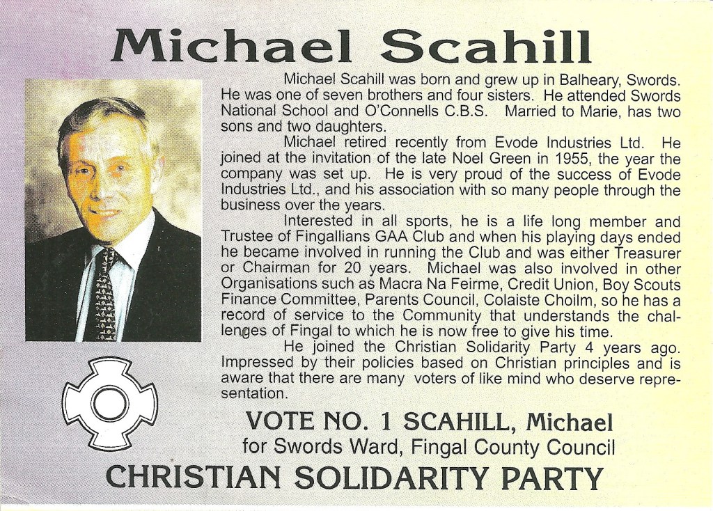 From the 1999 Local Elections a leaflet from Michael Scahill of The Christian Solidarity Party running in Swords. He polled 344 votes and missed out on a seat.