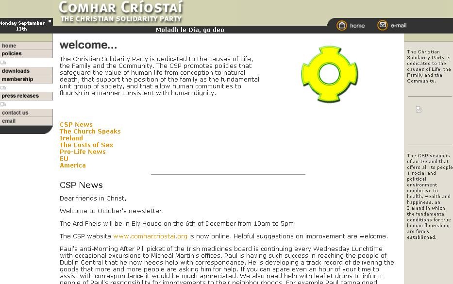 From 2003 a copy of the Christian Solidarity Party Website http://www.comharcriostai.org