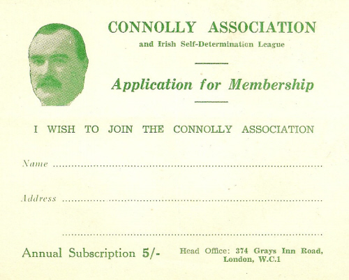 “The membership form for the Connolly Association, the Irish communist grouping in Britain. no date, but 1960s I think.”