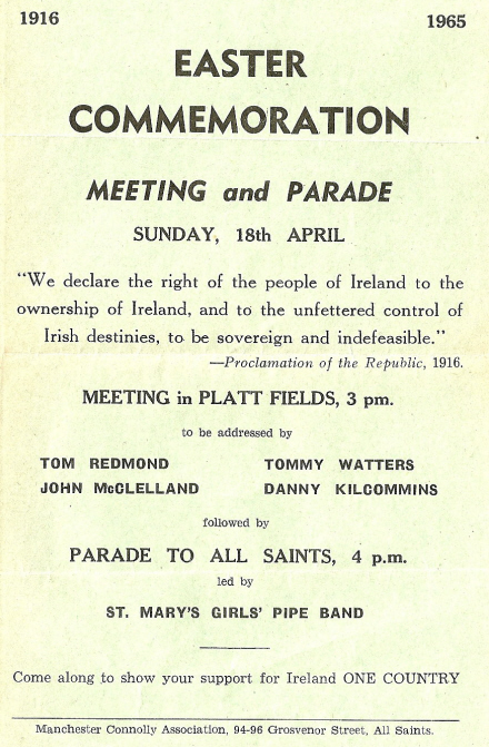From 1965 a Poster from The Manchester Connolly Association advertising an Easter Commemoration, Meeting and Parade.
