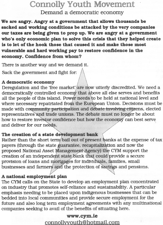 A 2009 leaflet “Demand a democratic economy” from the Connolly Youth Movement.