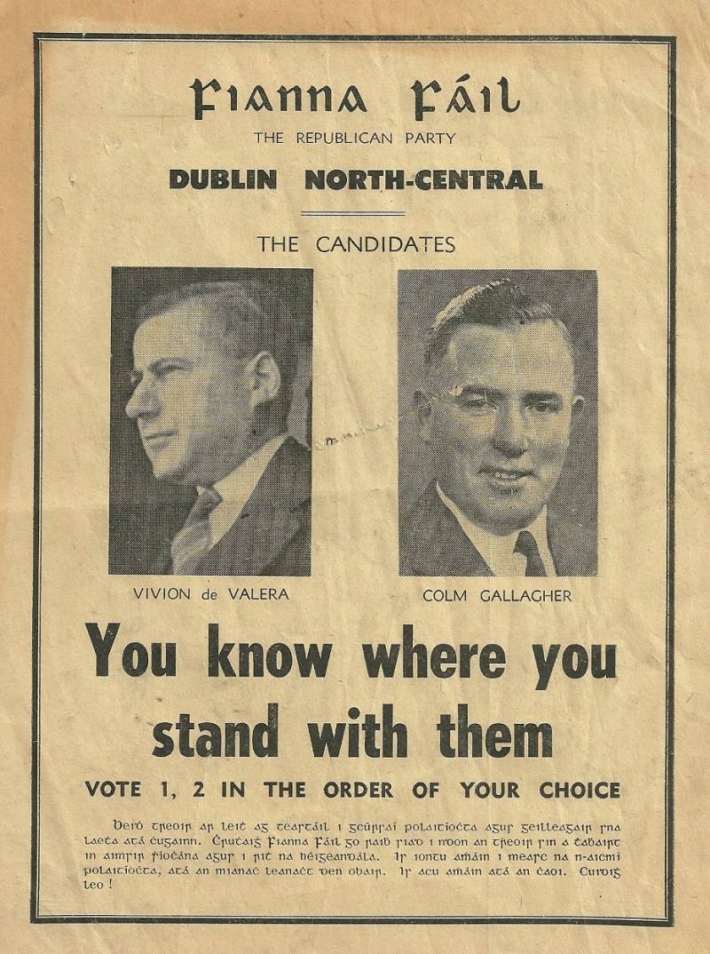 From the 1957 General Election a leaflet from Vivion De Valera and Colm Gallagher running for Fianna Fáil in Dublin North Central. Both candidates were elected.