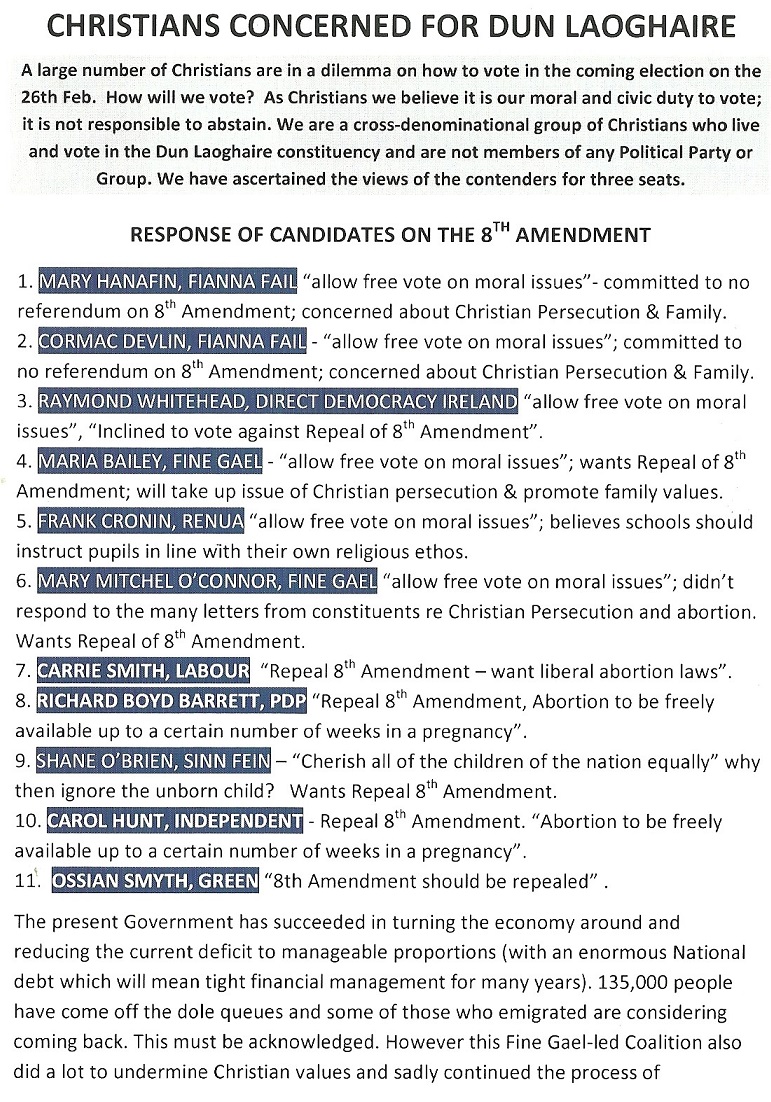 A Leaflet from ‘Christians Concerned For Dun Laoghaire’ regarding the General Election and candidates positions on Abortion and other issues. These were distributed outside masses in Dun Laoghaire constituency.