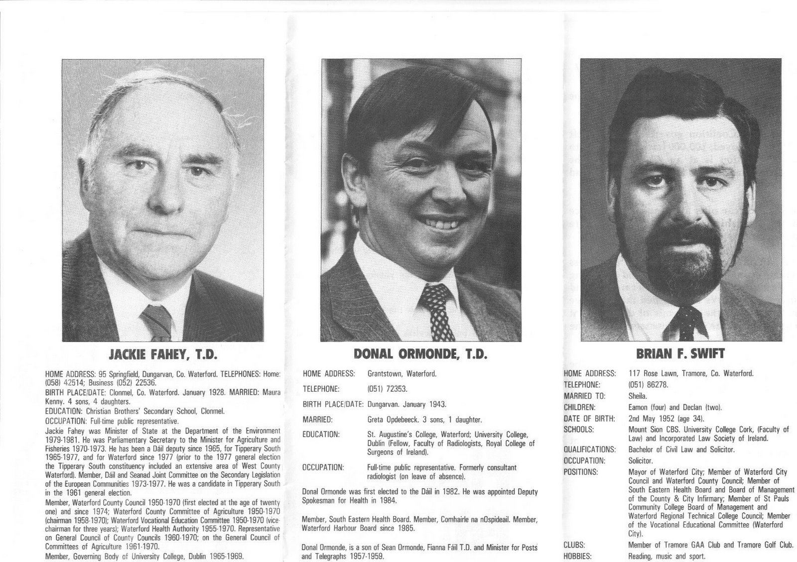 Faheys brithplace of Clonmel, County Waterford is still the postal address for some parts of West Waterford, such as The Nire and Ballinamult. Fahey and Swift won seats for Fianna Fail. That election also marked the election of the then PD Martin Cullen to the Dail and the defeat of Fine Gael TD Eddie Collins who had held a seat since 1969.
