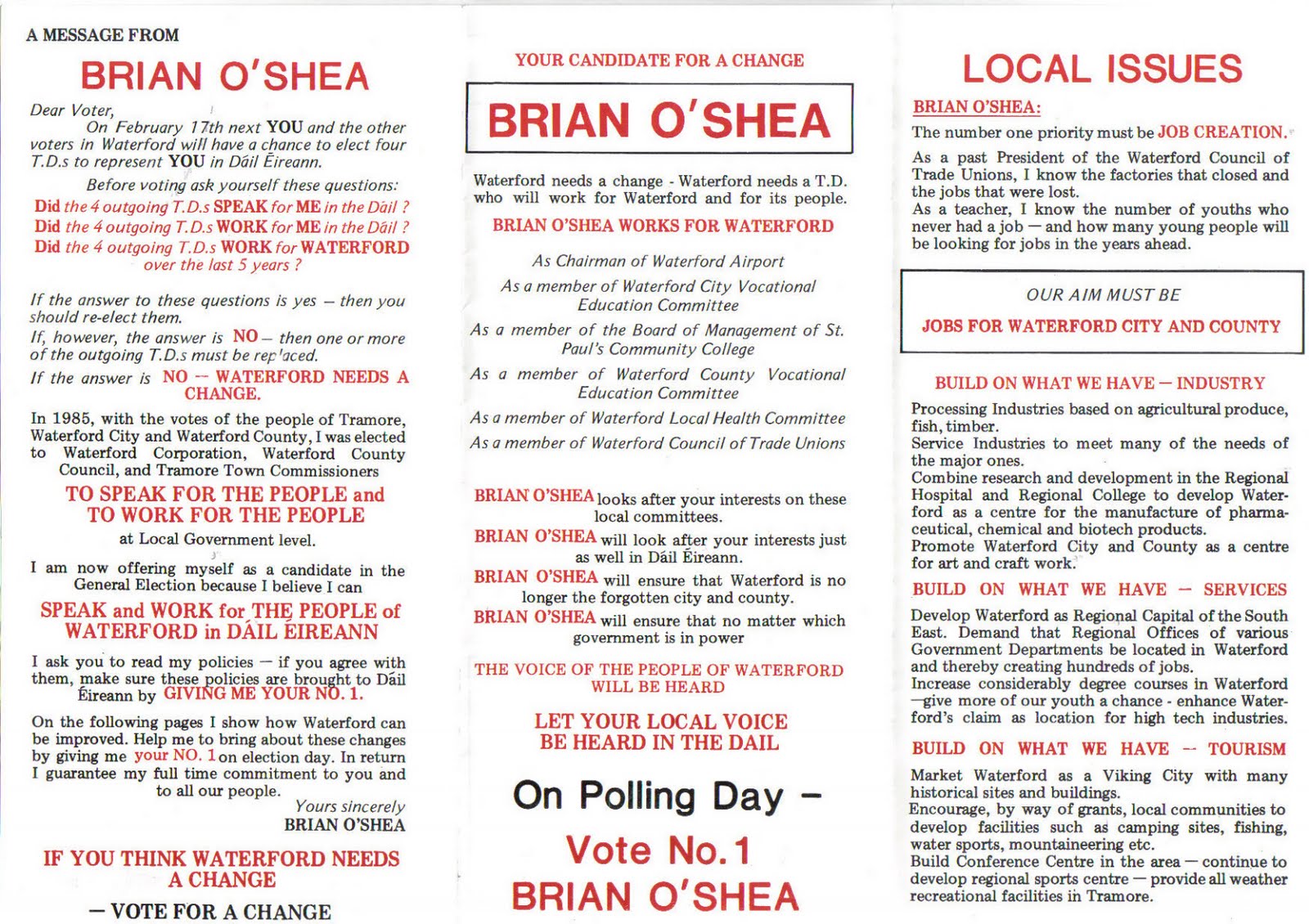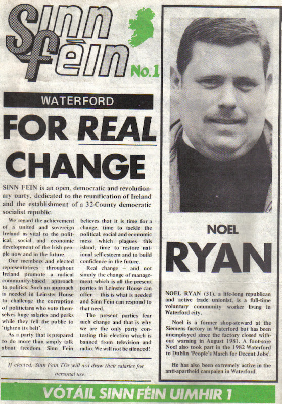 From the 1987 General Election a leaflet from Noel Ryan standing for Sinn Fein in Waterford. Ryan poled 758 votes and failed to win a seat. He also stood in the 1985 and 1991 Local Elections without success.