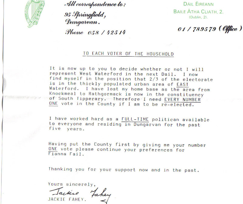 A letter from Jackie Fahey who pleads with voters to help him out after the constituency has been redrawn.