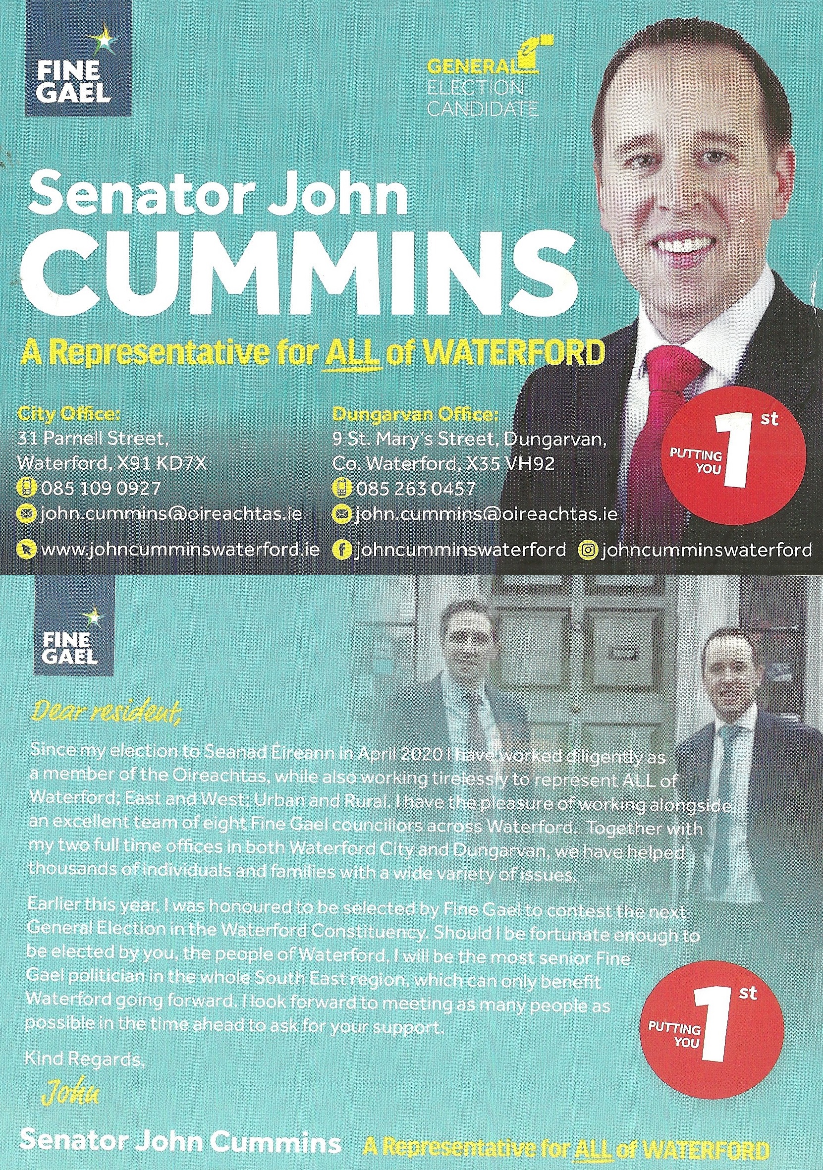 A leaflet from John Cummins who is running for Fine Gael in Waterford in the 2024 General Election.