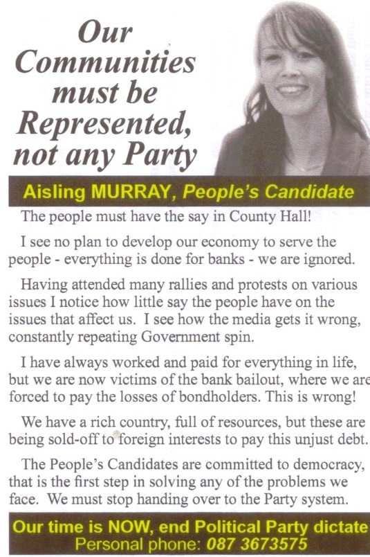 Leaflet from Aisling Murray -People’s Candidate (CPPC) -East Cork -2014 Local Elections April 11, 2014