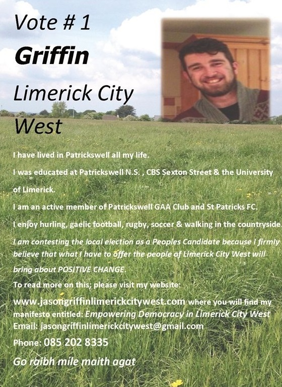 a leaflet from Jason Griffin who is runnig as a People’s Candidate (CPPC) in Limerick City West for a seat on Limerick County Council.