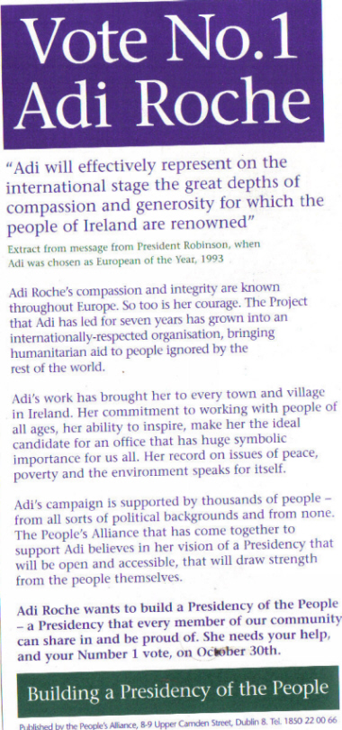 Adi Roche, the highly respected Founder of The Chernobyl Children’s Project ran in the 1997 Presidential election. She had been nominated by the Labour Party, Democratic Left and Green Party.