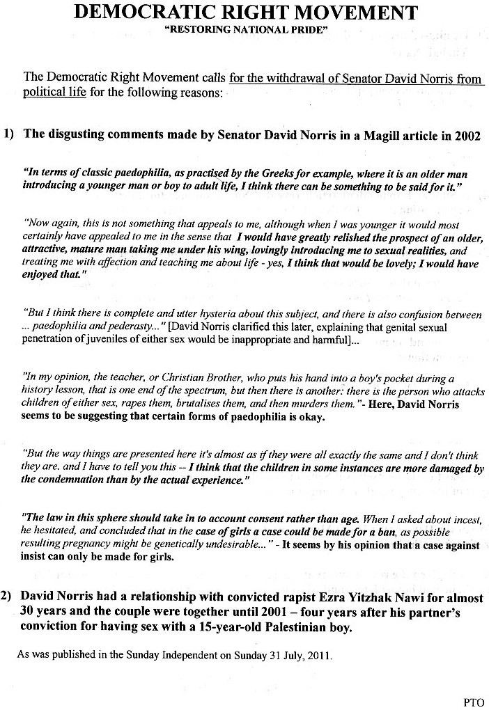 Leaflet ..”calling for the withdrawal of Senator David Norris from political life” – Democratic Right Movement September 22, 2011
