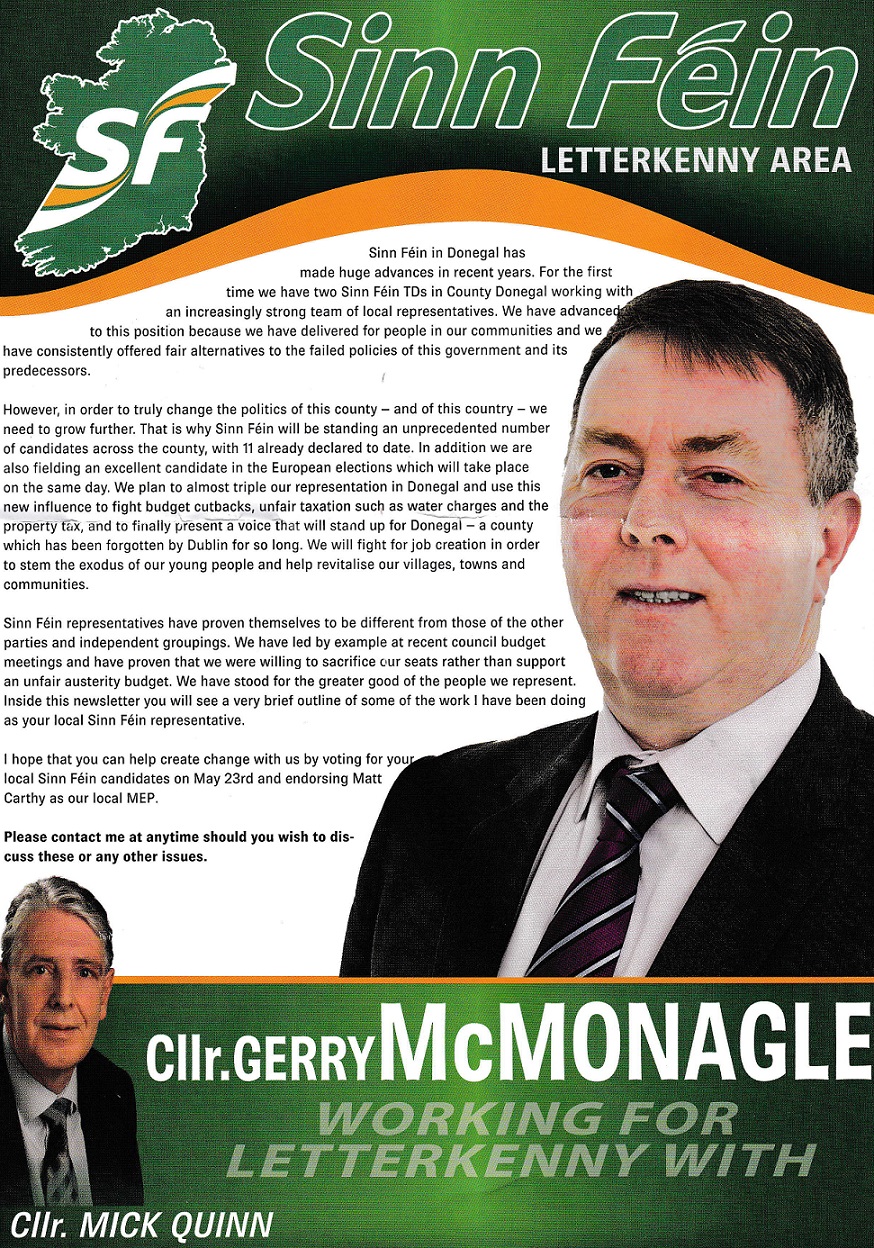 Leaflet from Gerry McMonagle , Mick Quinn -Sinn Fein -Letterkenny April 18, 2014