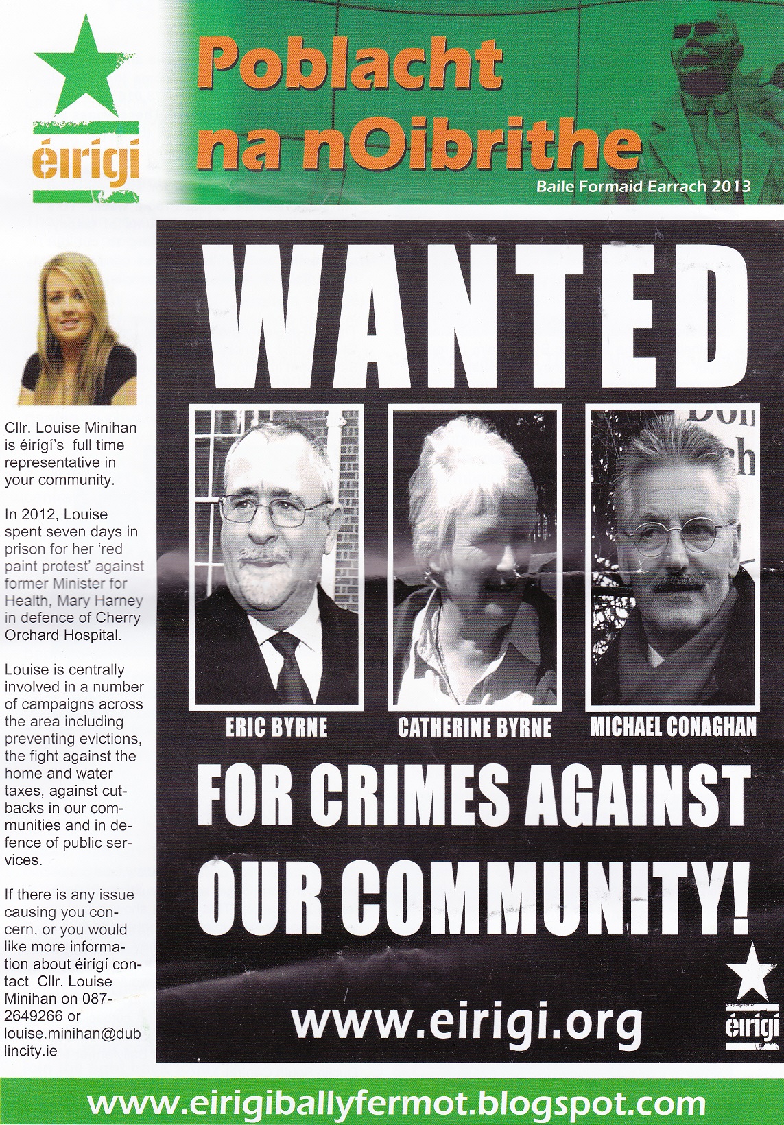 From Éirígí Ballyfermot a leaflet ‘Poblacht na nOibrithe’ Baile Formaid Earrach 2013 which attacks the local Government TDs, promotes the local éirígí Councillor Louise Minihan. The leaflet also attacks the property Tax, Water tax.