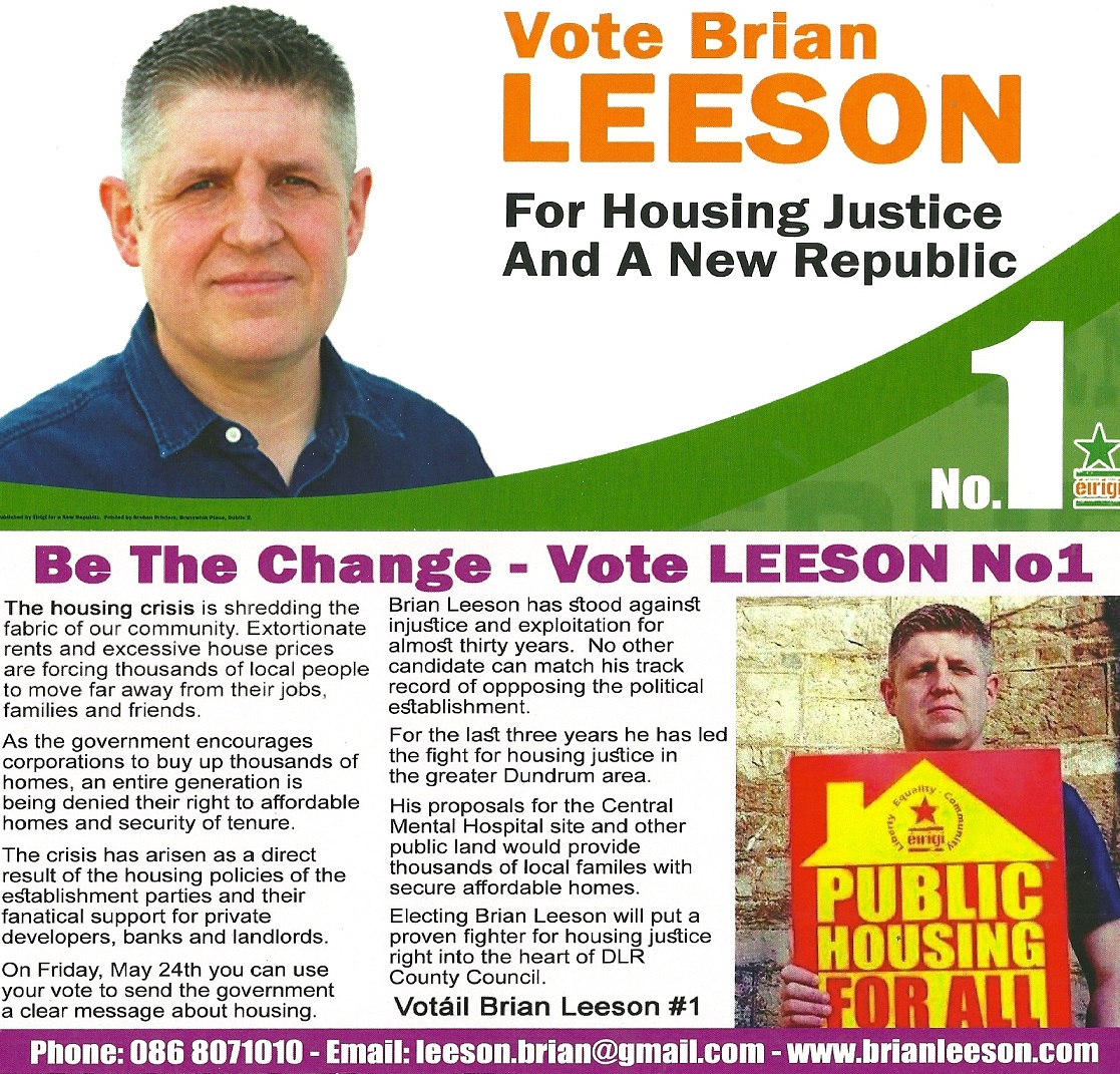 A Leaflet from Brian Leeson who is running for Éirígí in Dundrum for a seat on Dun Laoghaire Rathdown County Council.