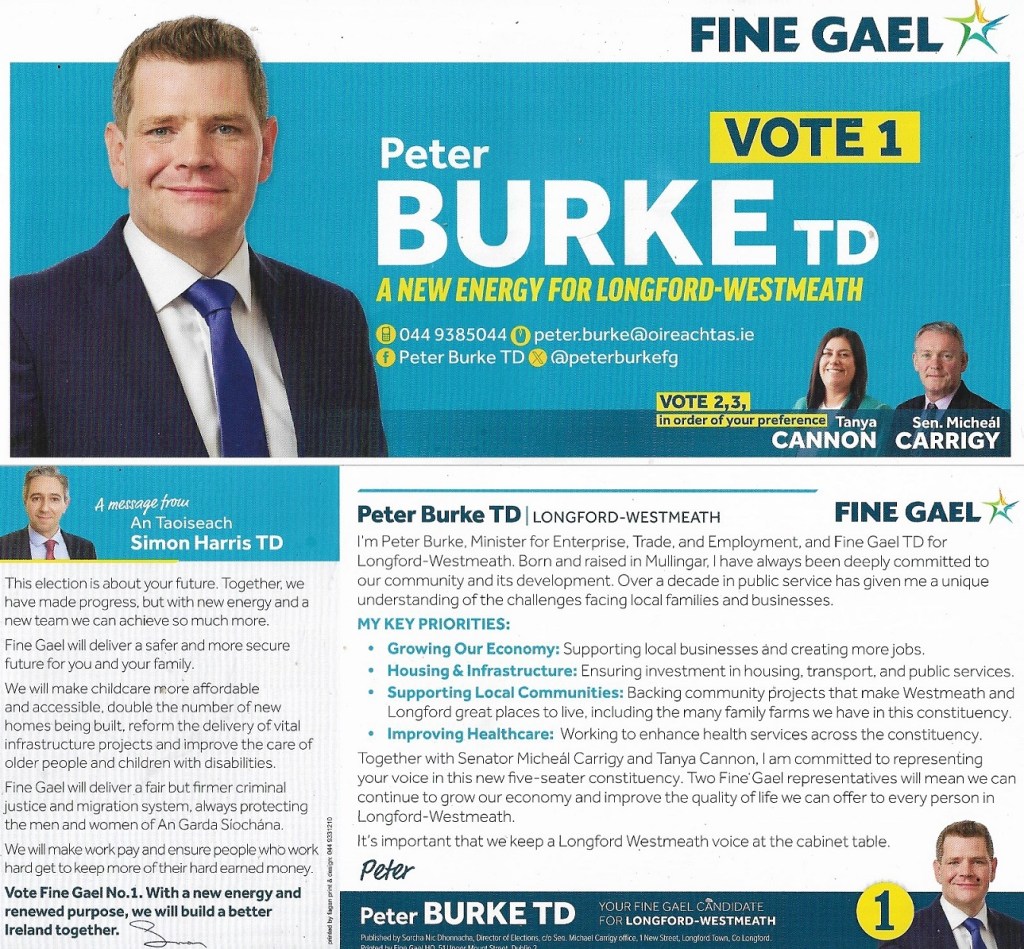 Leaflet from Peter Burke – Fine Gael – Longford Westmeath – 2024 General Election