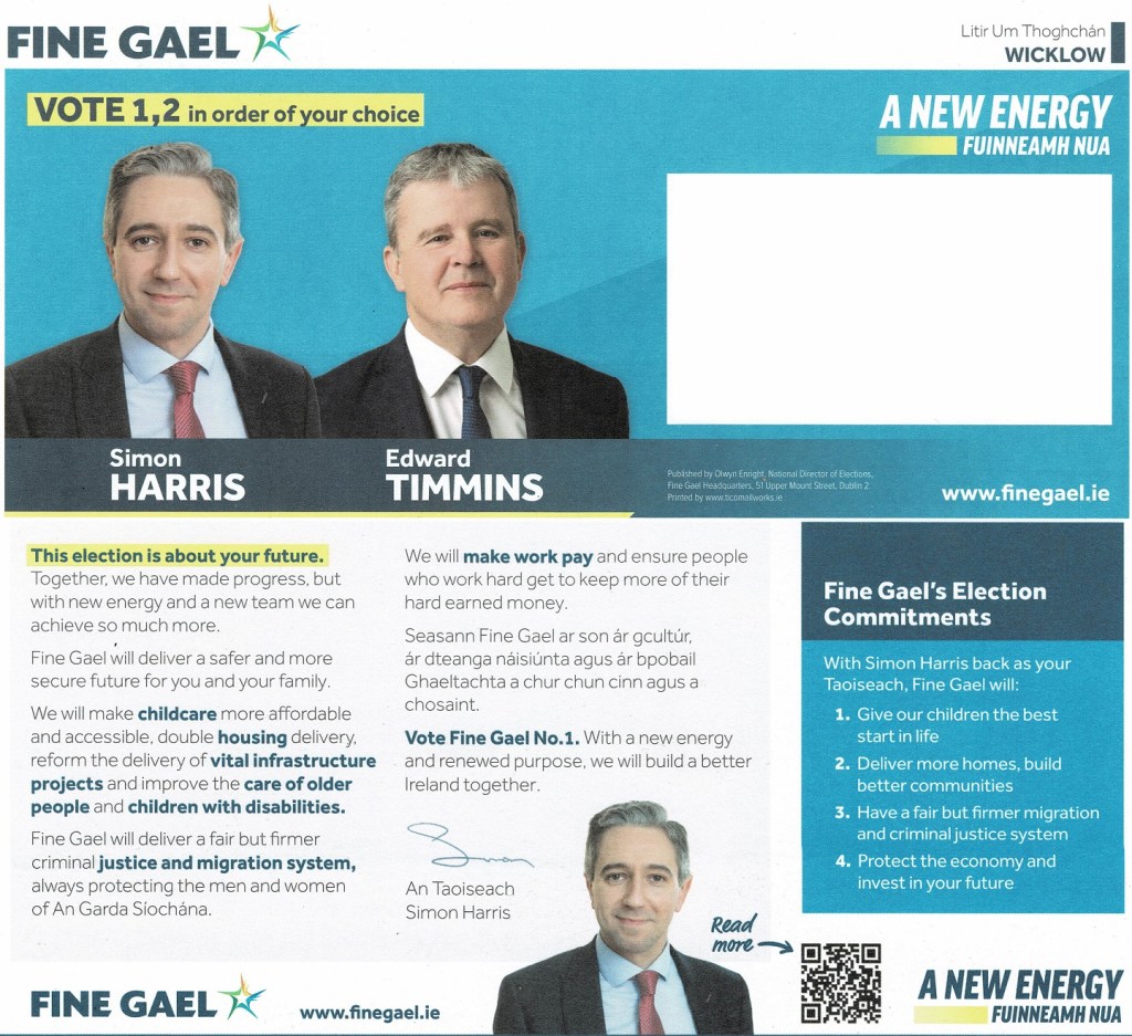 A Leaflet from Simon Harris and Edward Timmins running for Fine Gael in Wicklow in the 2024 General Election