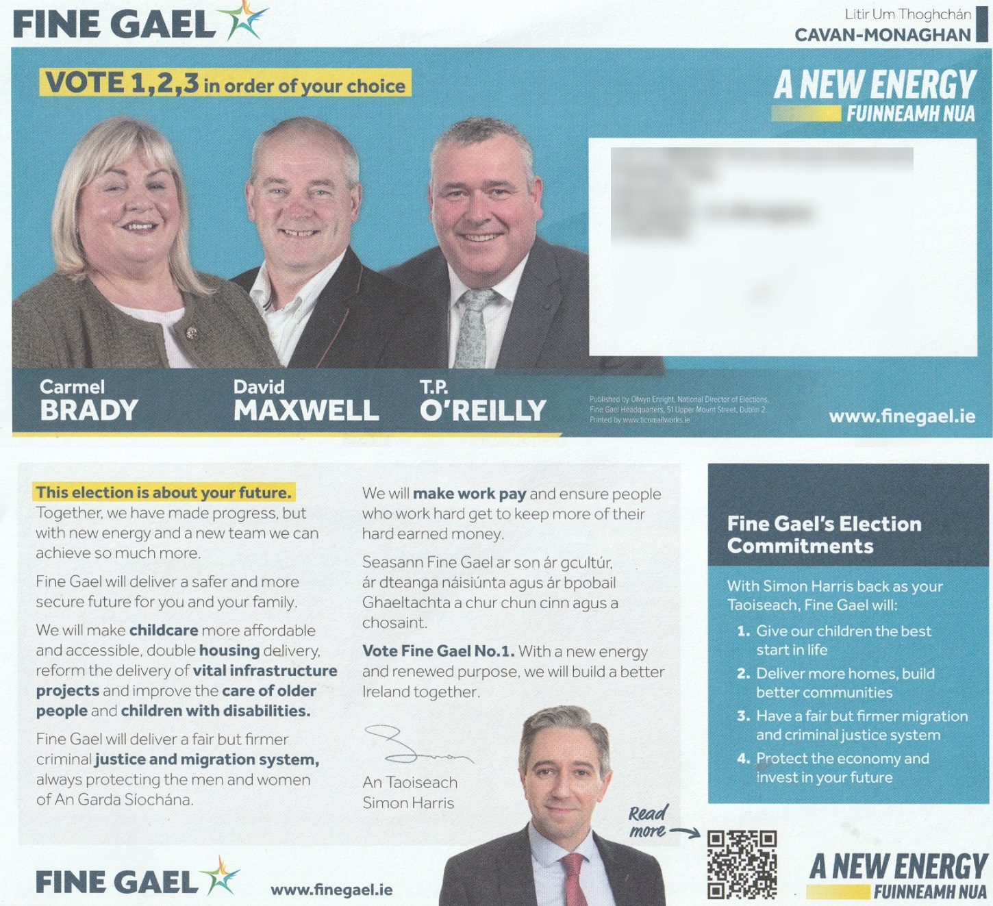 Leaflet from Carmel Brady, David Maxwell , T.P. O’Reilly – Fine Gael – Cavan Monaghan – 2024 General Election November 24, 2024