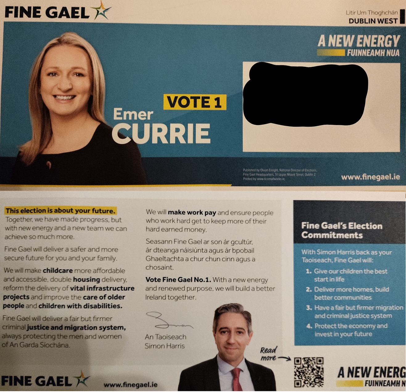 Leaflet from Emer Currie – Fine Gael – Dublin West – 2024 General Election November 26, 2024