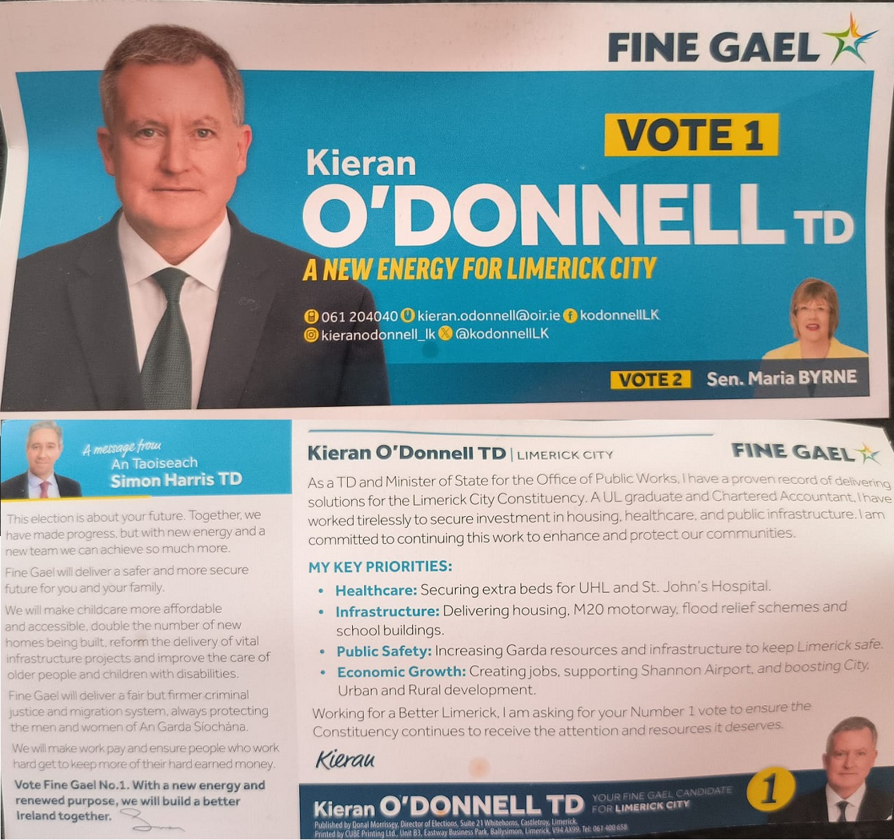 A Leaflet from Kieran O’Donnell who is running for Fine Gael in Limerick City in the 2024 General Election