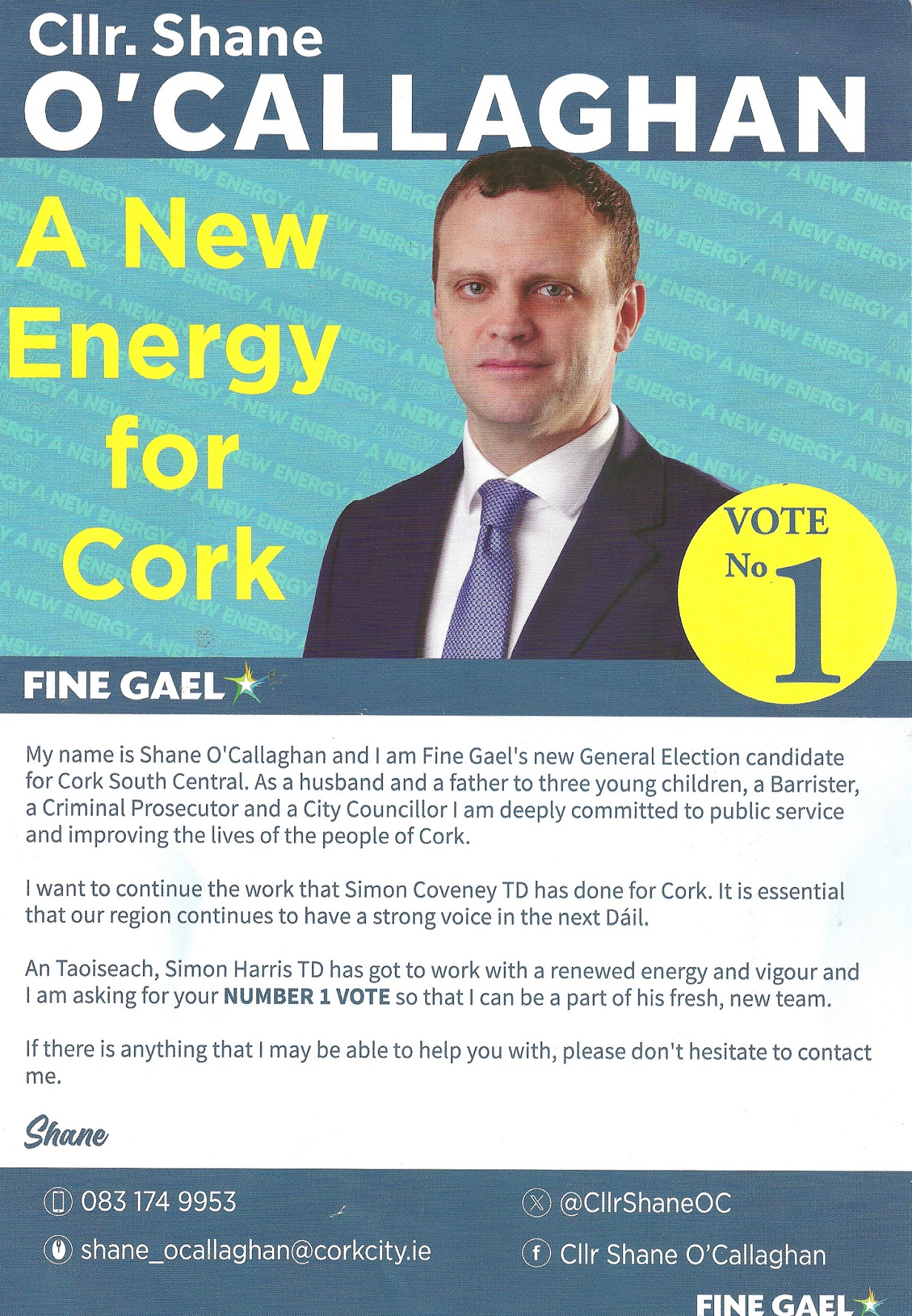 Leaflet from Shane O’Callaghan – Fine Gael – Cork South Central – 2024 General Election November 22, 2024