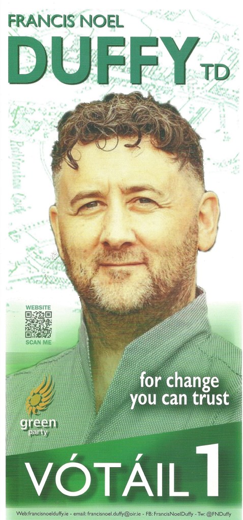 A Leaflet from Francis Noel Duffy who is running for The Green Party in Dublin South West in the 2024 General Election