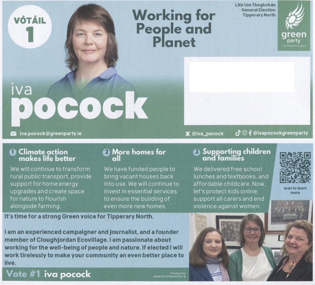 A leaflet from Iva Pocock who is running for The Green Party in Tipperary North in the 2024 General Election