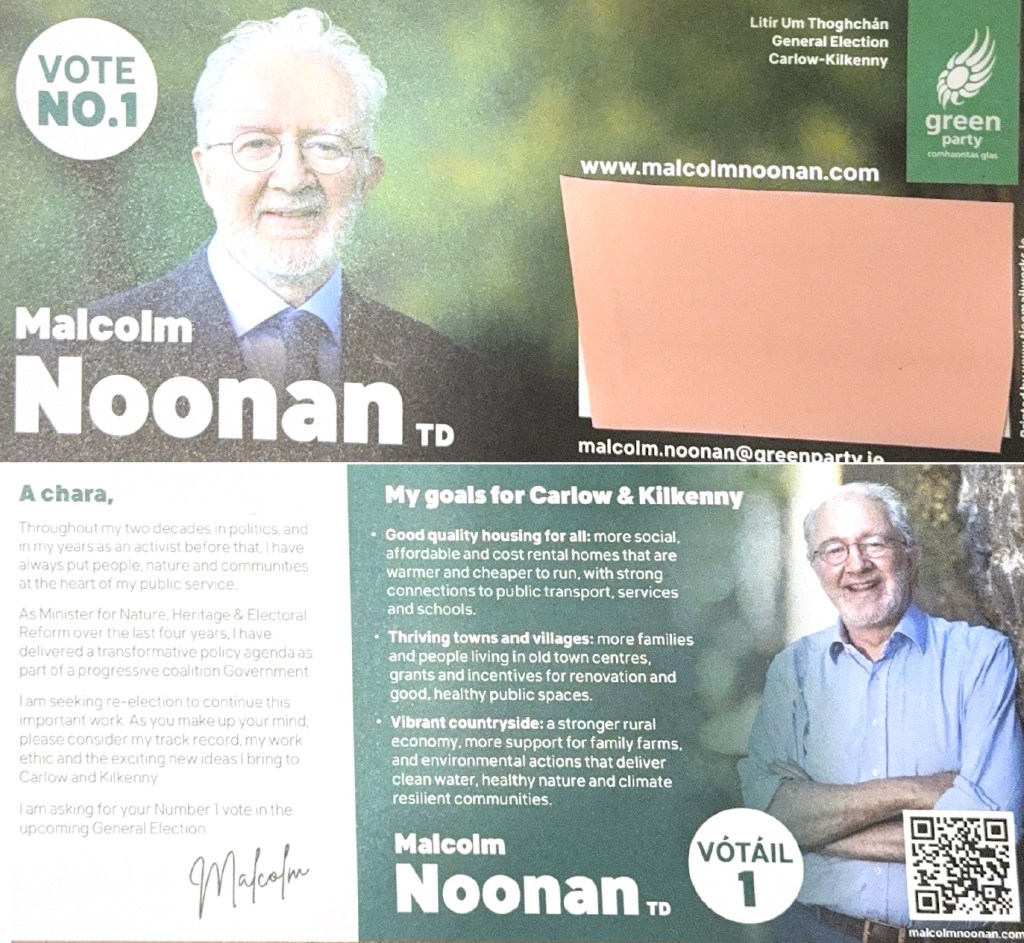 A Leaflet from Malcolm Noonan who is running for The Green Party in Carlow Kilkenny in the 2024 General Election