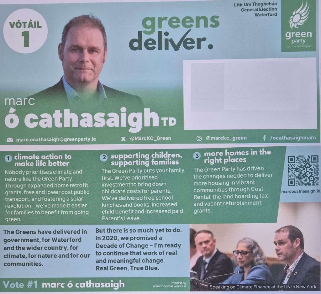 Leaflet from Marc Ó Cathasaigh who is running for The Green Party in Waterford in the 2024 General Election